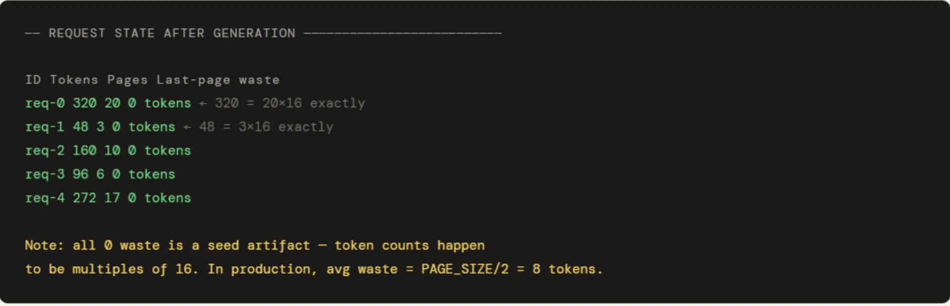 Five requests are run with token counts of 320, 48, 160, 96, and 272. The output shows pages allocated proportionally to actual usage — req-1 with 48 tokens gets 3 pages, req-0 with 320 tokens gets 20. When req-1 is freed, its 3 pages go straight back to the pool and are immediately reusable. The pool utilisation at 10.9% looks low only because 512 pages were provisioned for 5 small requests — in a fully loaded production pool it would sit near the 98% range seen in Section 4. The “0 tokens wasted” in the last-page column is a seed artifact — all five token counts happen to be exact multiples of 16. In practice, the average last-page waste is PAGE_SIZE / 2 = 8 tokens per request.