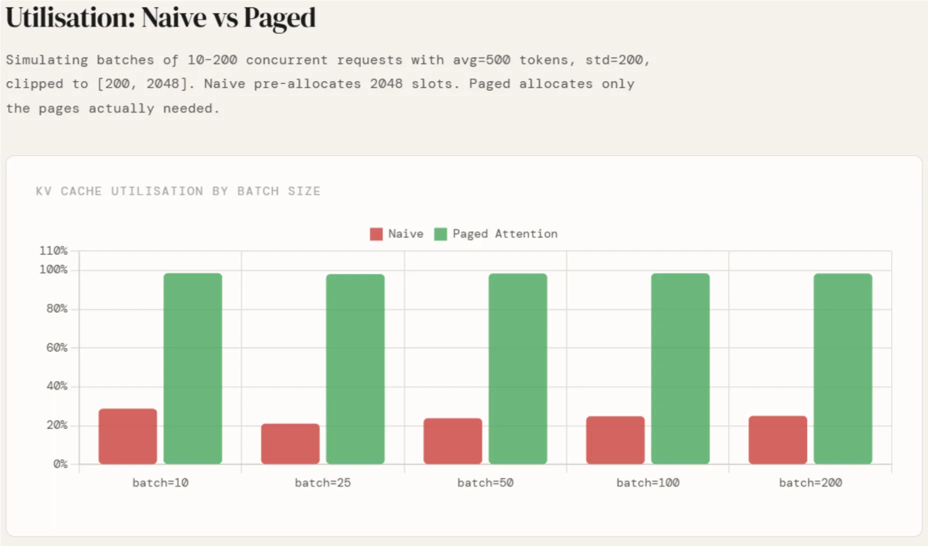 paged_utilisation takes the same actual token counts but computes how many pages each request would need — ceil(tokens / 16). The only waste is the unfilled tail of each request’s last page, which averages 8 tokens. Utilisation is actual_tokens_sum / (pages_allocated × 16).