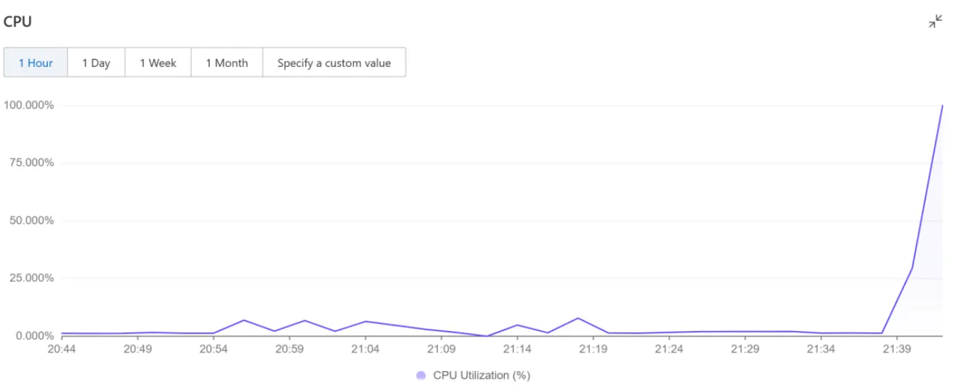 Once triggered, the script caused a sharp CPU utilization surge to near 100% saturation, effectively launching a denial-of-service attack against the host infrastructure.