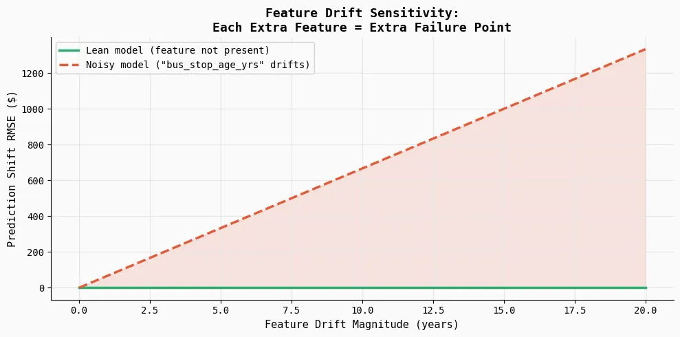 This experiment illustrates how feature drift can silently affect model predictions in production. The code introduces gradual drift into a weak feature (bus_stop_age_yrs) and measures how much the model’s predictions change. Since the lean model does not include this feature, its predictions remain completely stable, while the noisy model becomes increasingly sensitive as the drift magnitude grows.