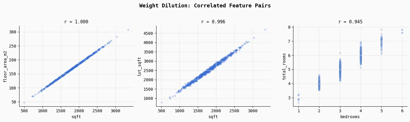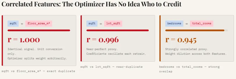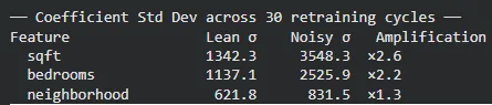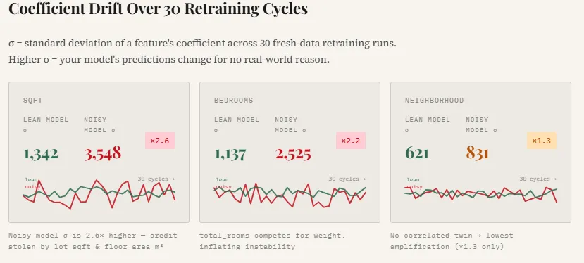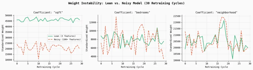 For example, the standard deviation of the sqft coefficient increases by 2.6×, while bedrooms becomes 2.2× more unstable compared to the lean model. The plotted lines make this effect visually obvious—the lean model’s coefficients remain relatively smooth and consistent across retraining cycles, whereas the noisy model’s weights fluctuate much more. This instability arises because correlated and irrelevant features force the optimizer to redistribute credit unpredictably, making the model’s behavior less reliable even if overall accuracy appears similar.