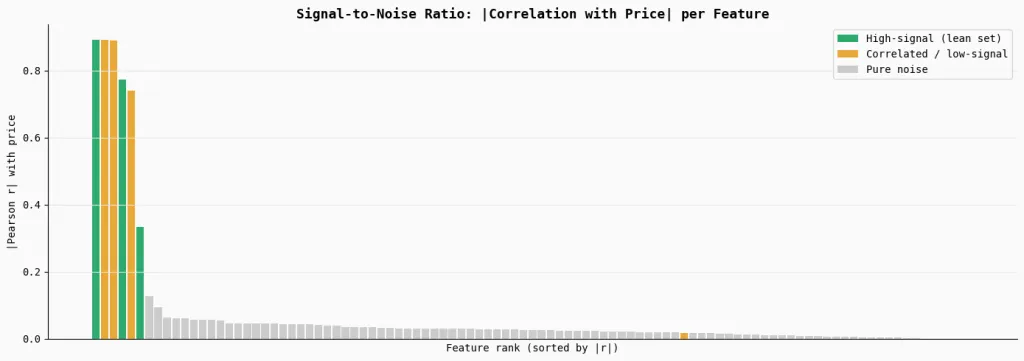 This section measures the signal strength of each feature by computing its absolute correlation with the target variable (price). The bar chart ranks all features by their correlation, highlighting the true high-signal features in green, correlated or weak features in orange, and the large set of pure noise features in gray.