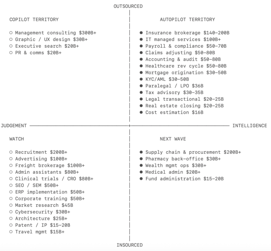 So, that’s one axis, autopilot (intelligence) vs copilot (judgment). The next axis in the analysis (see image below) is outsource vs insource.