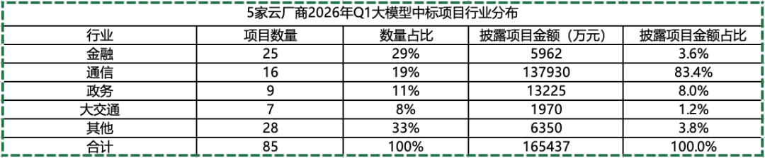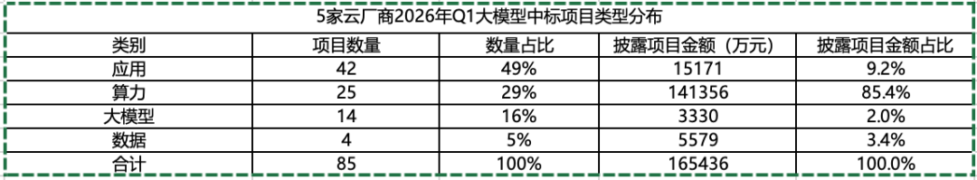 2026年第一季度,智能超参数统计到1632个大模型中标项目,披露中标金额76.8亿元。5家云厂商中标项目数量累计为85个,数量占比为5.2%;披露中标金额累计约为16.5亿元,金额占比约21.5%。