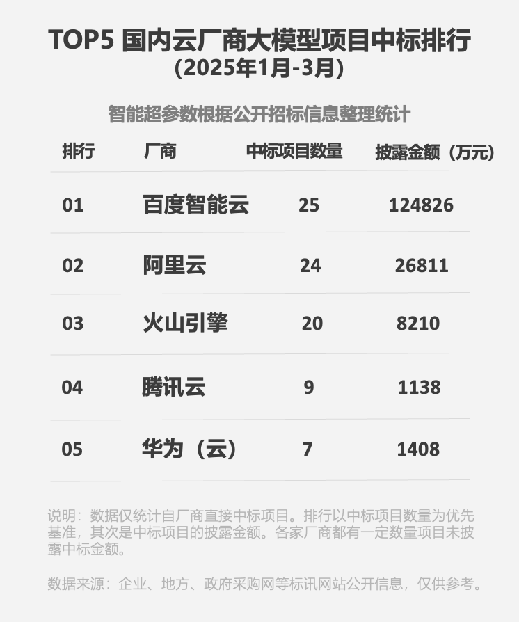 云厂商Q1大模型中标成绩单:前三均20+中标,第一金额5倍领先