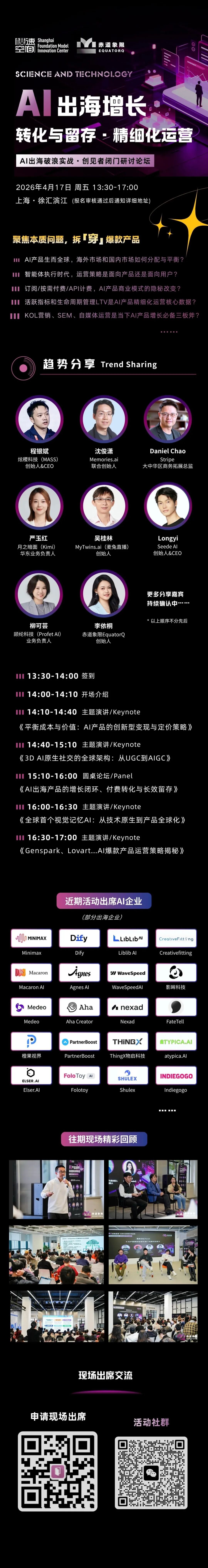 2026年4月17日(周五),模速空间和入驻企业赤道象限EquatorQ共同举办「AI出海增长:转化与留存・精细化运营」主题论坛,以闭门深度交流的核心定位,聚焦AI产品全球化增长的本质问题,拆解爆款产品的运营逻辑,为AI出海创业者搭建高价值的行业交流与资源对接平台。