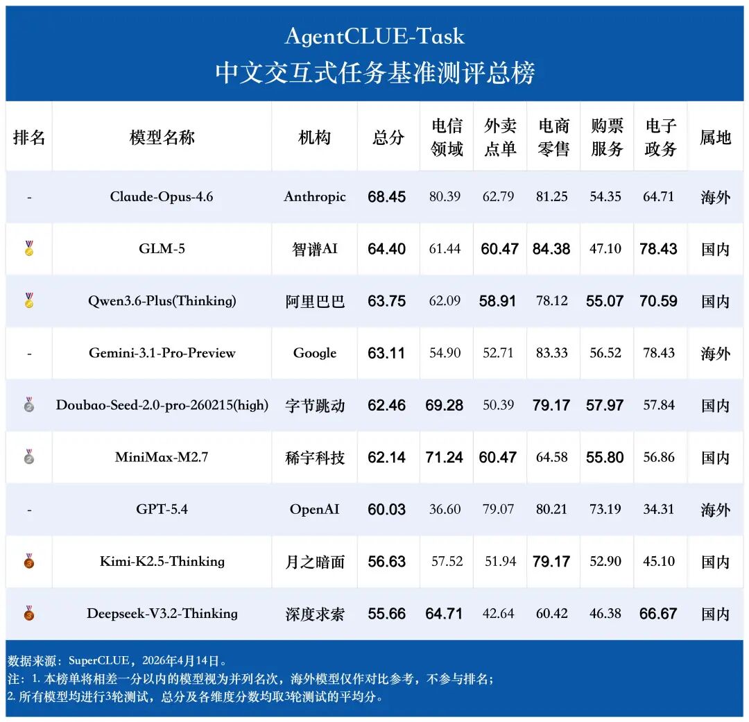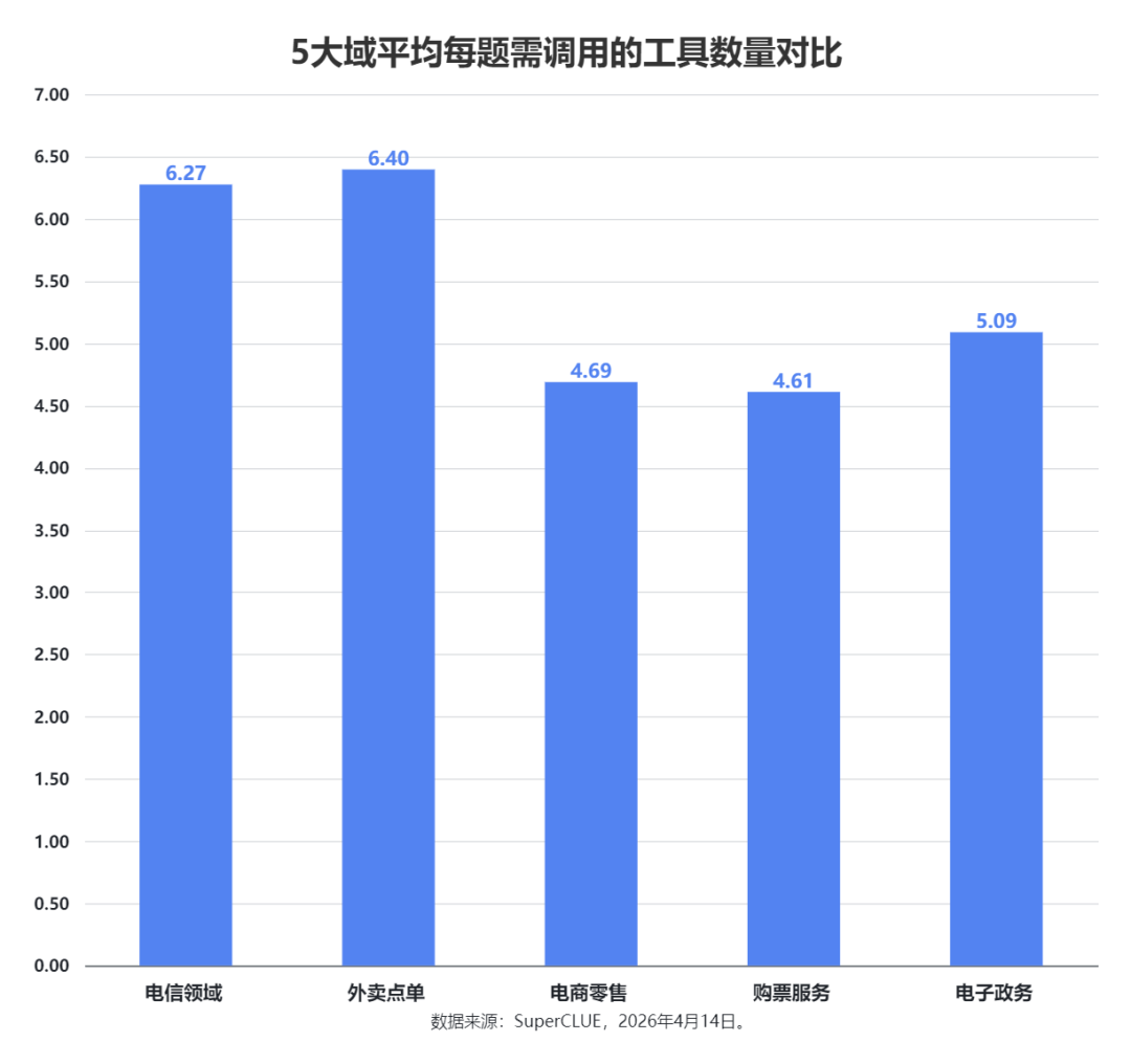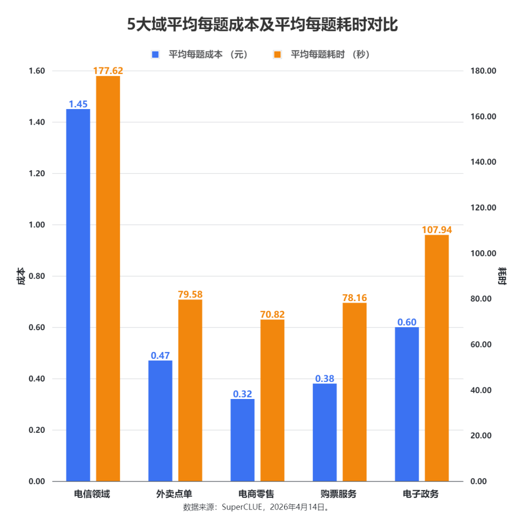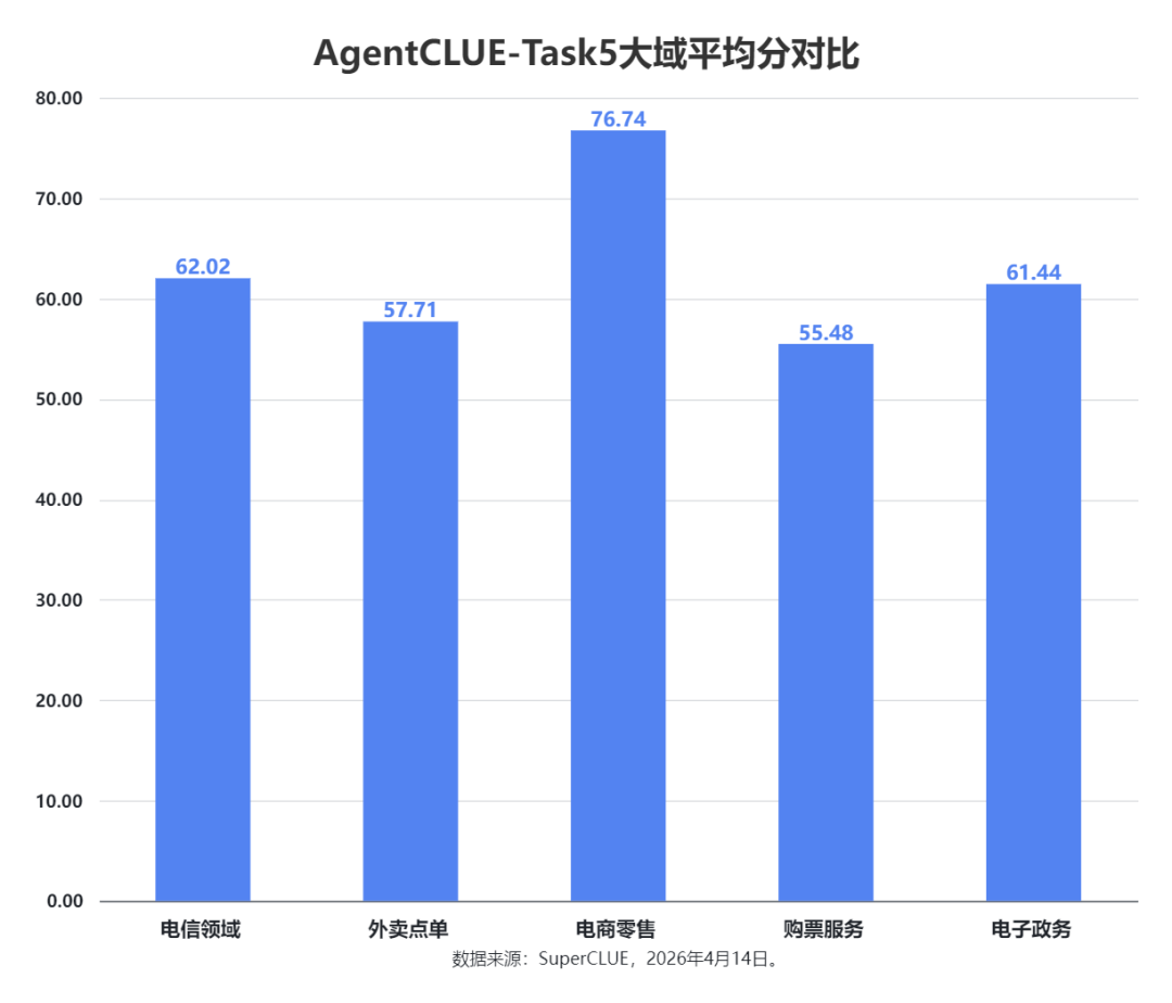 GPT-5.4 的领域分布最极端,它在 外卖点单、电商零售 和 购票服务 上表现非常亮眼,但在 电信领域 和 电子政务 上明显偏弱,是典型的强弱项分化非常大的模型。