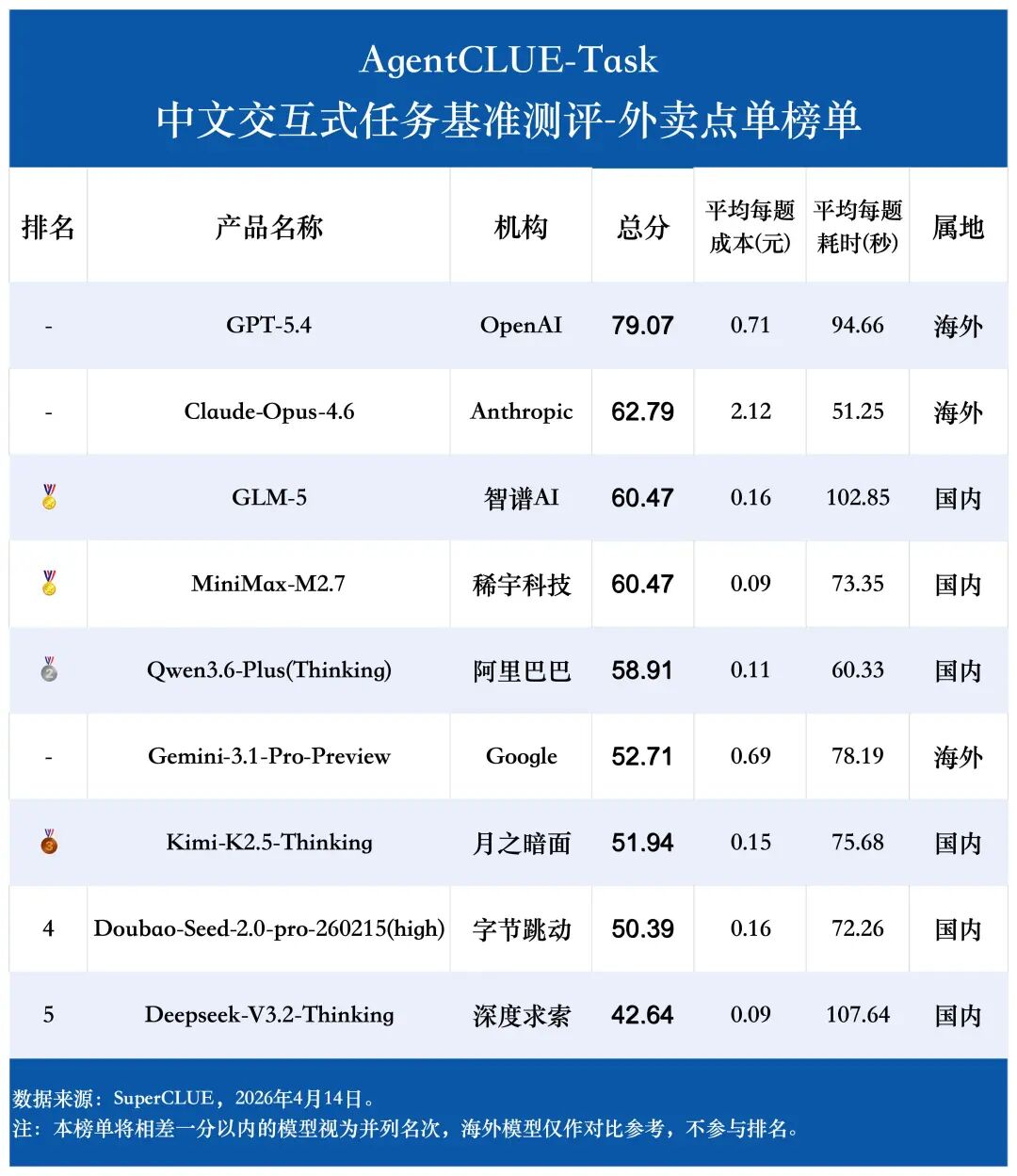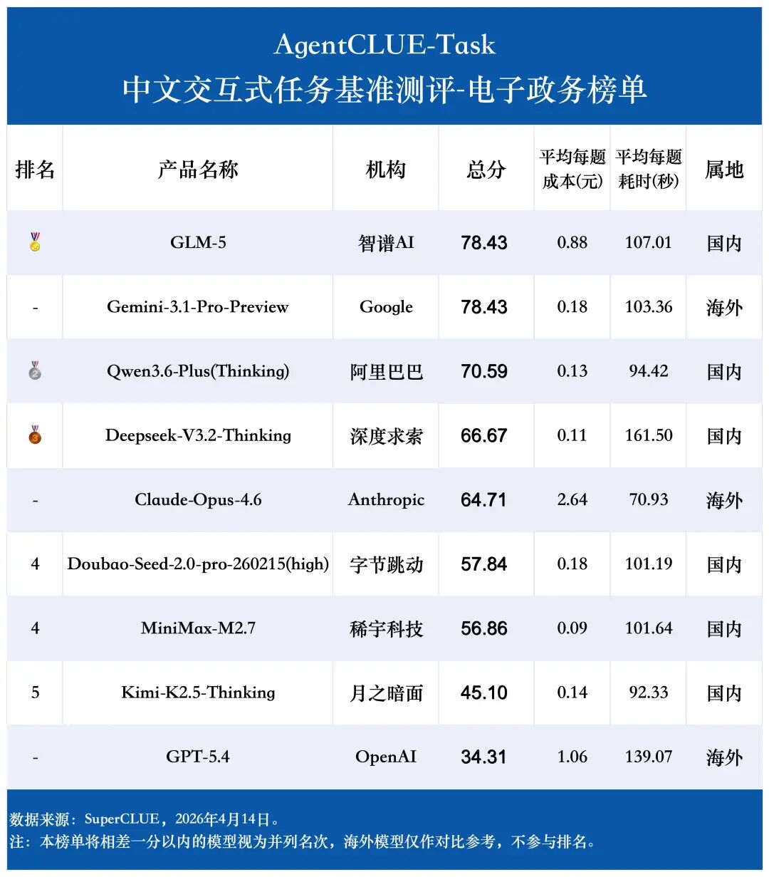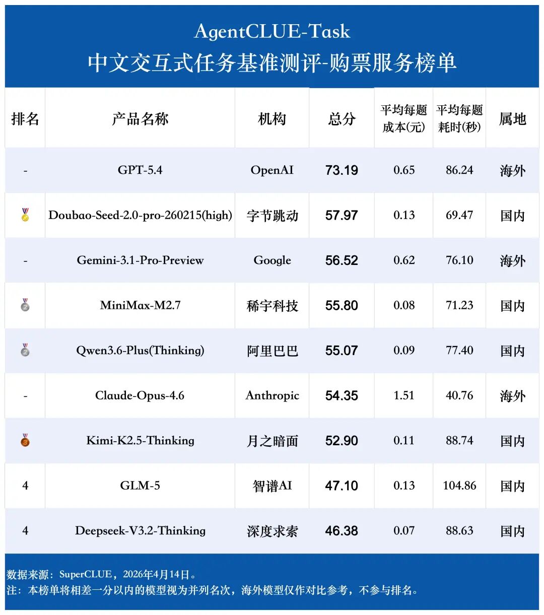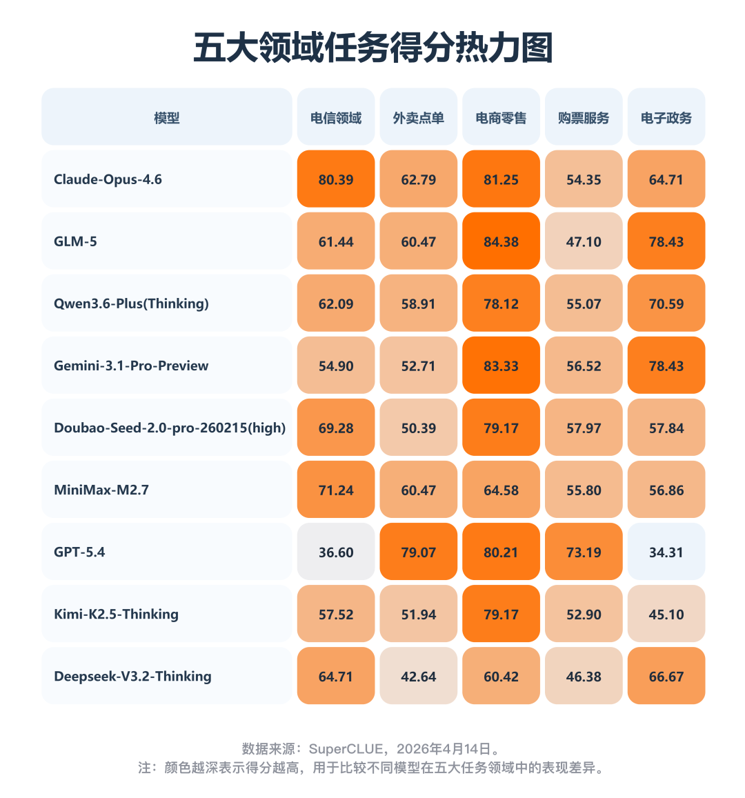 GPT-5.4 的领域分布最极端,它在 外卖点单、电商零售 和 购票服务 上表现非常亮眼,但在 电信领域 和 电子政务 上明显偏弱,是典型的强弱项分化非常大的模型。