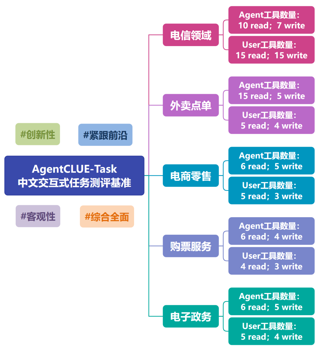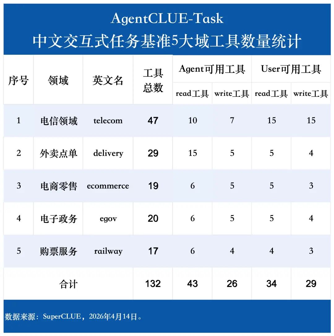 本次 AgentCLUE-Task 中文交互式任务测评基准共设计了132个工具,其中包括电信领域(telecom)的47个工具、外卖点单(delivery)领域的29个工具、电子政务(egov)领域的20个工具、电商零售(ecommerce)领域的19个工具,以及购票服务(railway)领域的17个工具。