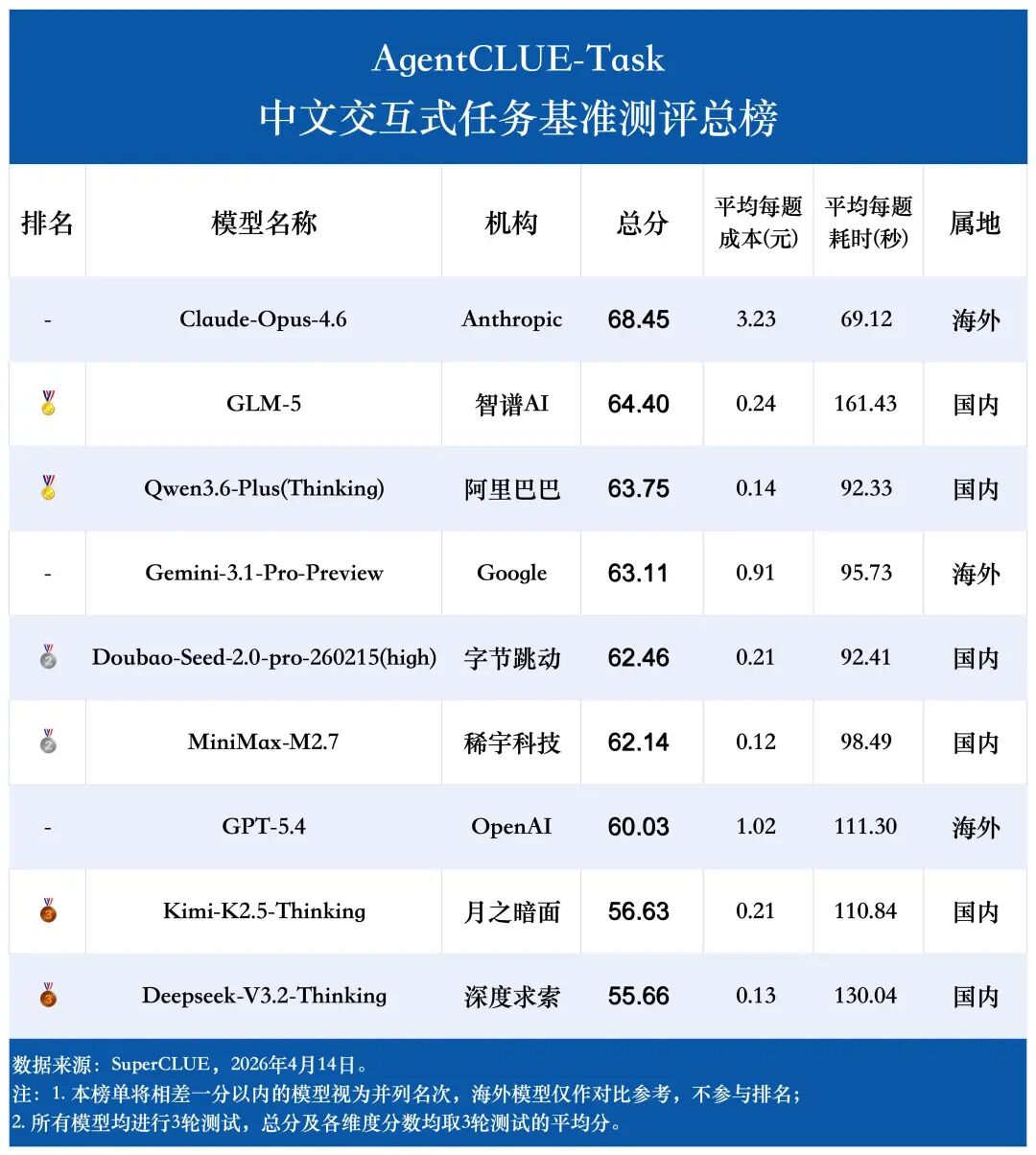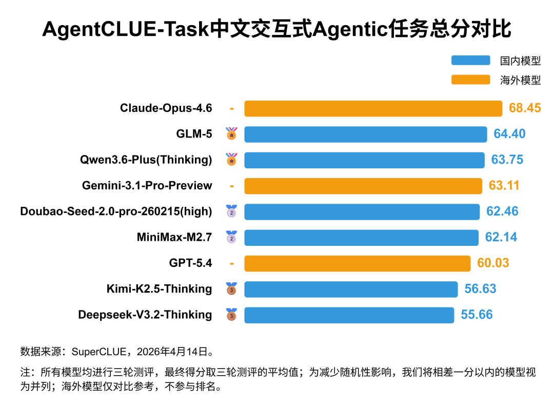 Claude-Opus-4.6在本次测评中以 68.45 分夺得榜首,国内的GLM-5和Qwen3.6-Plus(Thinking)分别以 64.40 分和 63.75 分领跑国内,具有超越海外顶尖模型Gemini-3.1-Pro-Preview的优异表现;Doubao-Seed-2.0-pro-260215(high)和MiniMax-M2.7分别以 62.46 分和 62.14 分并列国内第二。