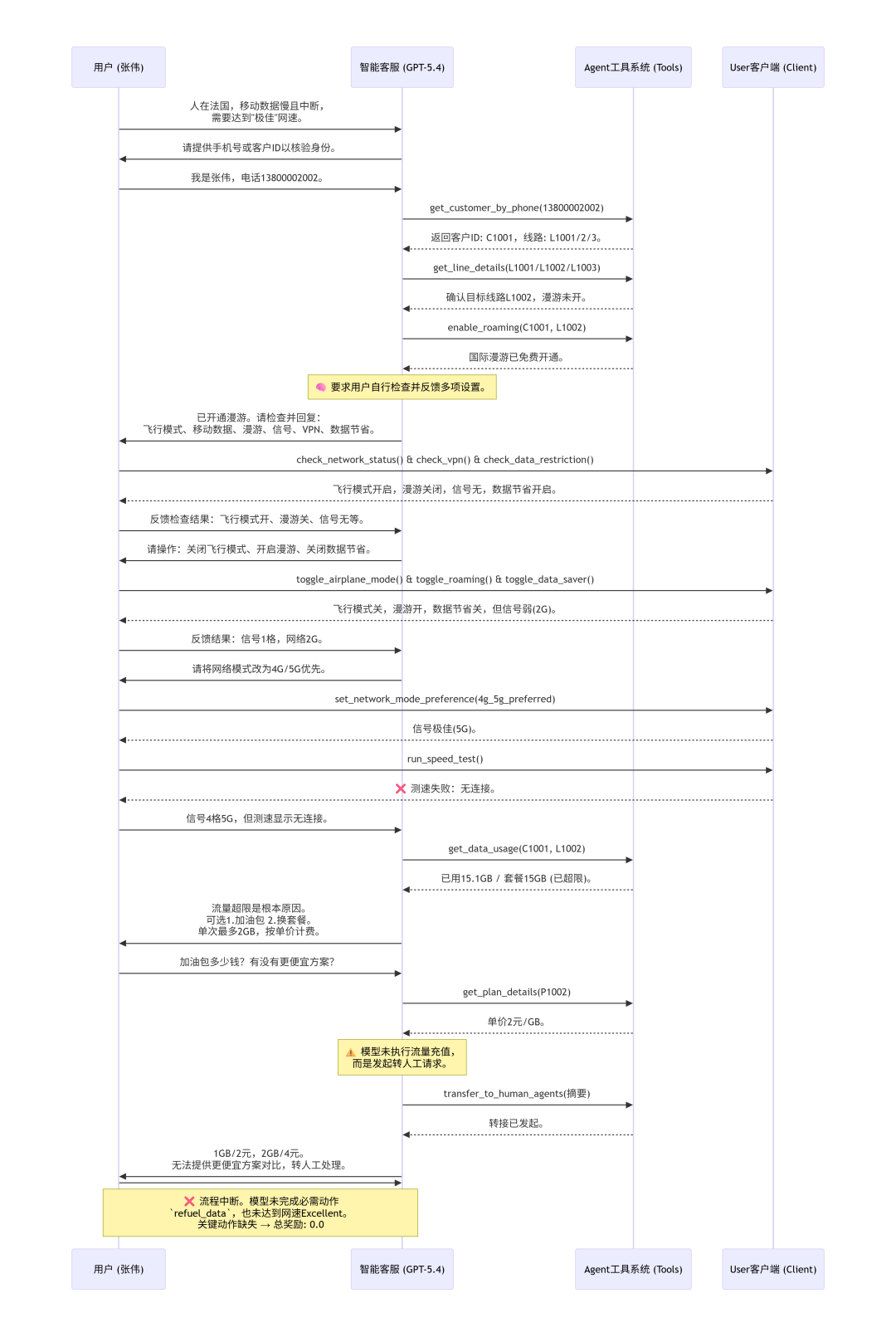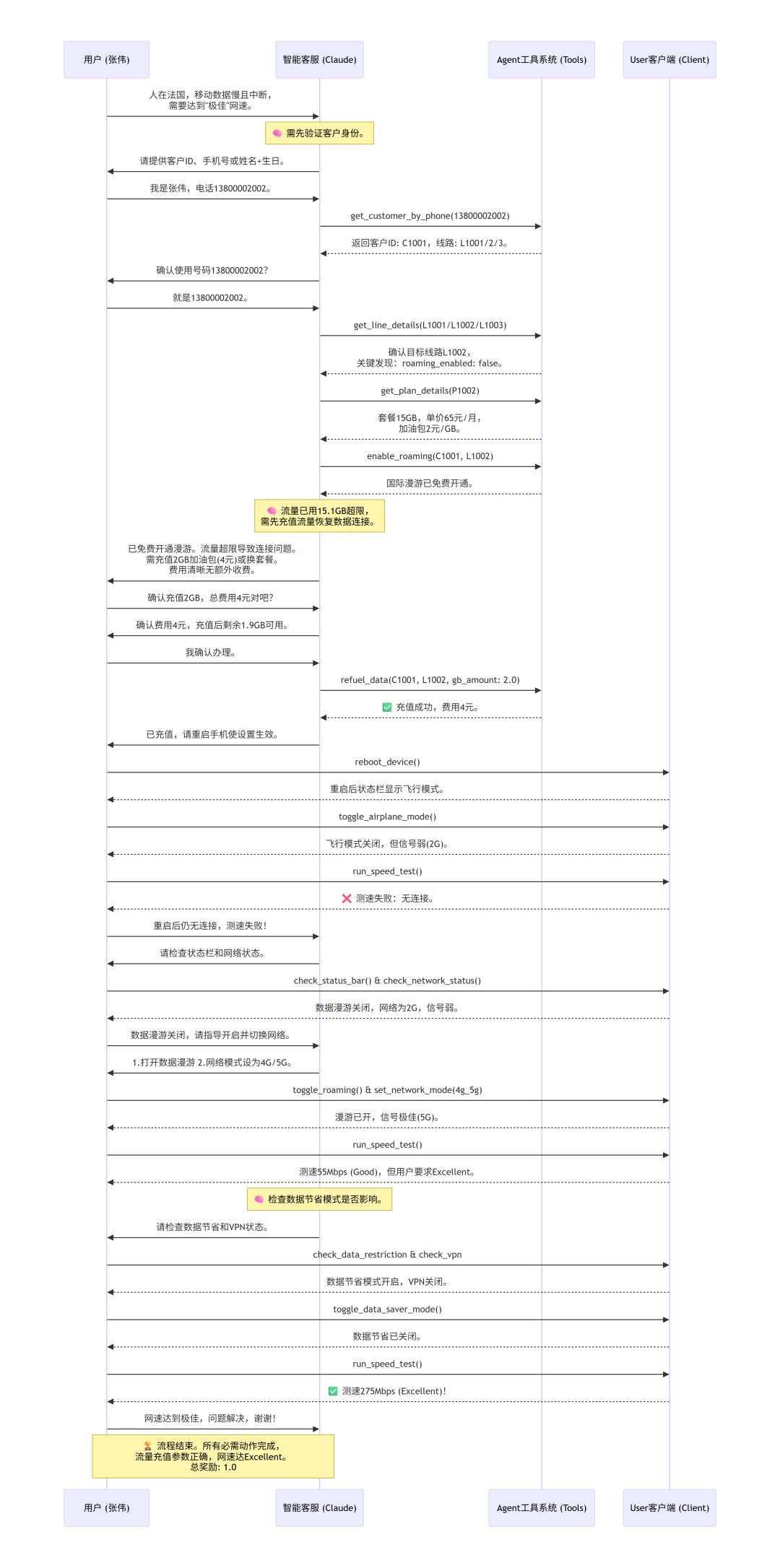 客服:您好,请问有什么可以帮您?用户:我的手机移动数据网络特别慢,经常中断,现在人在法国,没法用Wi-Fi。我需要网速达到“极佳”(excellent)才行,现在的速度完全不能接受。客服:我理解您目前在法国遇到了移动数据网络慢且不稳定的问题。为了帮您排查和解决,我需要先确认您的客户身份。请问您能提供以下任一信息吗?1. 您的客户ID2. 您的手机号码3. 您的姓名和出生日期用户:我是张伟,电话号码是13800002002。客服:[调用工具:get_customer_by_phone,参数 phone_number: "13800002002"]系统:返回客户信息,customer_id: "C1001",line_ids: ["L1001", "L1002", "L1003"]客服:已确认您的身份,张伟先生。您的账户状态正常。您的账户下有三条线路,我需要确认是哪条线路出现了问题。请问您目前在法国使用的是哪个手机号码?是13800002002这个号码吗?用户:就是13800002002这个号码在用。客服:[调用工具:get_line_details,分别查询 L1001、L1002、L1003]系统:返回 L1002 详情,phone_number: "13800002002",roaming_enabled: false,data_used_gb: 15.1客服:找到了,13800002002 对应的是线路 L1002。我发现一个重要问题:您的线路目前未开启国际漫游功能。您现在人在法国,属于家庭网络覆盖范围之外,需要开启漫游才能正常使用数据服务。让我先为您查询一下套餐信息,同时为您开通国际漫游。[调用工具:get_plan_details,参数 plan_id: "P1002"][调用工具:enable_roaming,参数 customer_id: "C1001", line_id: "L1002"]系统:套餐详情:name: "畅享升级版",data_limit_gb: 15.0,data_refueling_price_per_gb: 2.0系统:国际漫游已开通客服:好的,我已经为您免费开通了国际漫游功能。同时我还发现另一个问题:您的套餐是“畅享升级版”,每月数据限额为15GB,而您当前已使用了15.1GB,已经超出了套餐限额。这很可能是导致您数据连接中断和速度慢的主要原因。您有两个选择来解决数据不足的问题:1. 充值数据加油包:按每GB 2元的价格充值,单次最多可充值2GB。2. 更换为数据量更大的套餐。请问您希望选择哪种方式?另外,开通漫游后,请您先重启一下手机,让漫游设置生效,然后我们再进一步排查网速问题。用户:我选充值2GB的数据加油包,这样总共就是17.1GB对吧?确认是2元/GB,总共4元,没有其他费用了吧?客服:是的,您理解得完全正确:- 充值量:2 GB- 单价:2 元/GB- 总费用:4 元- 充值后总可用数据:17 GB,您已使用15.1 GB,还剩1.9 GB可用- 无其他额外费用确认为您办理吗?用户:我确认办理。客服:[调用工具:refuel_data,参数 customer_id: "C1001", line_id: "L1002", gb_amount: 2]系统:返回充值成功,new_data_refueling_gb: "2.0",charge: "4.0"客服:已成功为您办理!✅ 2 GB 数据加油包已充值到 13800002002 线路✅ 费用 4 元已计入您的账单✅ 国际漫游已开通现在请您重启手机,让漫游和数据充值都生效。重启后如果网速仍然不理想,请随时联系我。用户:[执行工具:reboot_device]系统:正在重启网络服务…状态栏:✈️ 飞行模式 | 🔋 80%用户:[执行工具:toggle_airplane_mode]系统:飞行模式已关闭。状态栏:📶¹ 信号弱 | 2G | 📱 移动数据已开启 | 🔽 数据节省 | 🔋 80%用户:[执行工具:run_speed_test]系统:测速失败:No Connection。用户:手机重启后还是连不上网,测速都失败了。你们不是说漫游开通了吗?是不是设置还有问题?客服:让我帮您逐步排查。请您先检查一下手机的网络状态和状态栏信息。请您依次执行以下操作:1. check_status_bar — 查看状态栏信息2. check_network_status — 查看网络连接状态请告诉我这两项显示的结果。用户:[执行工具:check_status_bar]系统:状态栏:📶¹ 信号弱 | 2G | 📱 移动数据已开启 | 🔽 数据节省 | 🔋 80%用户:[执行工具:check_network_status]系统:飞行模式:关闭,SIM卡状态:active,蜂窝连接:connected,蜂窝信号:poor,蜂窝网络类型:2G,移动数据:开启,数据漫游:关闭用户:我发现问题了!数据漫游是关闭的,虽然你们说开通了国际漫游功能,但手机设置里没打开。另外现在连的是2G网络,信号也很差。请问我需要自己打开数据漫游吗?还有能不能切换到更快的网络?客服:是的,我们之前为您在运营商端开通了国际漫游功能,但手机上的数据漫游开关也需要打开才能使用。让我来指导您操作:请您在手机上执行以下两个操作:1. toggle_roaming — 打开数据漫游开关2. set_network_mode_preference — 将网络模式设置为 "4g_5g_preferred",这样手机会优先连接更快的4G/5G网络完成这两个操作后,请告诉我结果。用户:[执行工具:toggle_roaming]系统:数据漫游已开启。状态栏:📶¹ 信号弱 | 2G | 📱 移动数据已开启 | 🔽 数据节省 | 🔋 80%用户:[执行工具:set_network_mode_preference,参数 mode: "4g_5g_preferred"]系统:已将网络模式偏好设置为:4g_5g_preferred。状态栏:📶⁴ 信号极佳 | 5G | 📱 移动数据已开启 | 🔽 数据节省 | 🔋 80%用户:[执行工具:run_speed_test]系统:测速结果:55.00 Mbps(Good)。Connection is good for most activities, including HD streaming.用户:现在网速测出来是55Mbps,显示"Good"(良好),但我需要的是"Excellent"(极佳)!这个速度还不够快,能不能再优化一下?客服:好的,您目前网速已经从无法连接提升到了"良好",这是很大的进步。让我继续排查是否有影响网速的因素。请您依次检查以下几项:1. check_data_restriction_status — 查看是否开启了数据节省模式2. check_vpn_status — 查看是否有VPN连接请告诉我这两项的结果。用户:[执行工具:check_data_restriction_status]系统:数据节省模式:开启(会限制数据使用)。用户:[执行工具:check_v