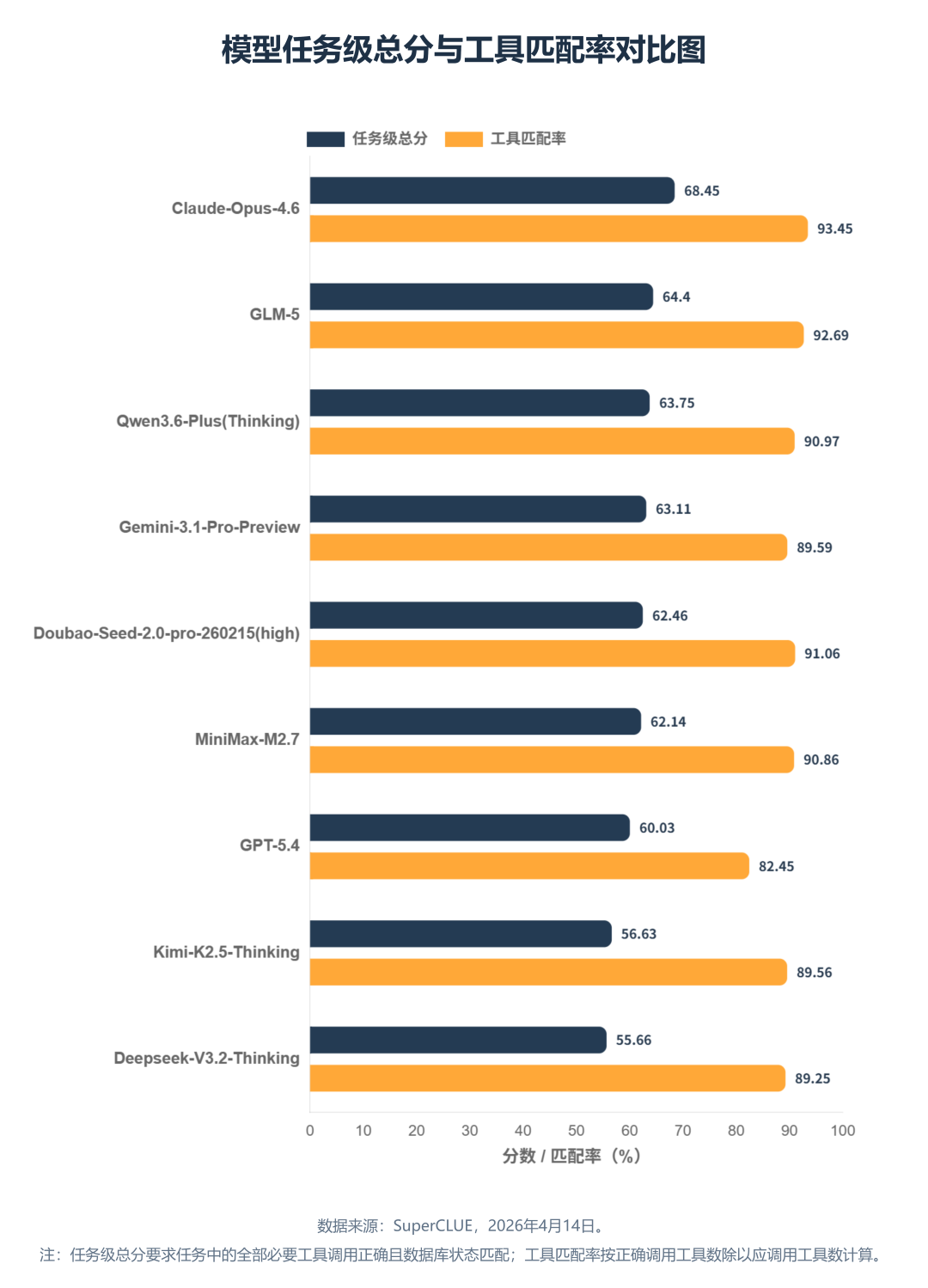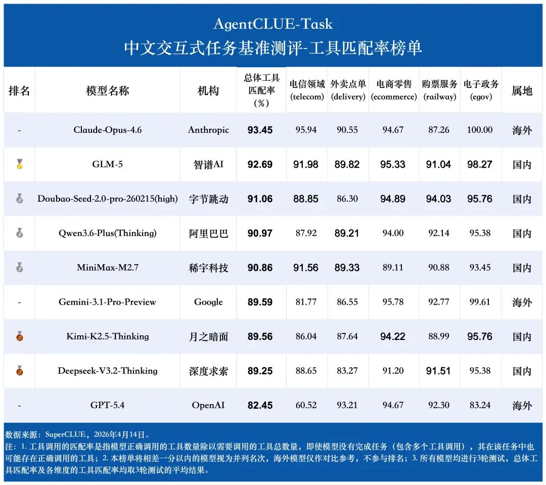 从总分和总体工具匹配率来看,Claude-Opus-4.6 和 GLM-5 是这次评测中最稳定的两个模型。它们在任务级和工具级两个维度上都位居前列,而且两个排名完全一致,说明这两类模型不仅会调工具,而且能把工具调用稳定地转化成任务成功。