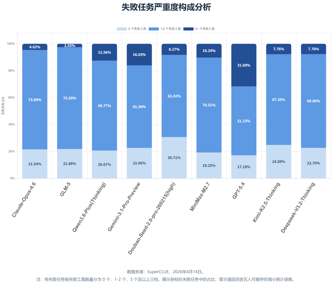 从失败严重度来看,Claude-Opus-4.6 和 GLM-5 的表现最稳。它们的失败虽然也主要集中在 1-2 个工具失误,但 3+ 连续失败的比例很低,说明这两类模型一旦出错,通常不会迅速演化为系统性偏航。相比之下,GPT-5.4 的 3+ 失败工具占比明显更高,说明它一旦偏离正确轨道,更容易进入连续失误状态,属于“失败时更容易雪崩”的类型。