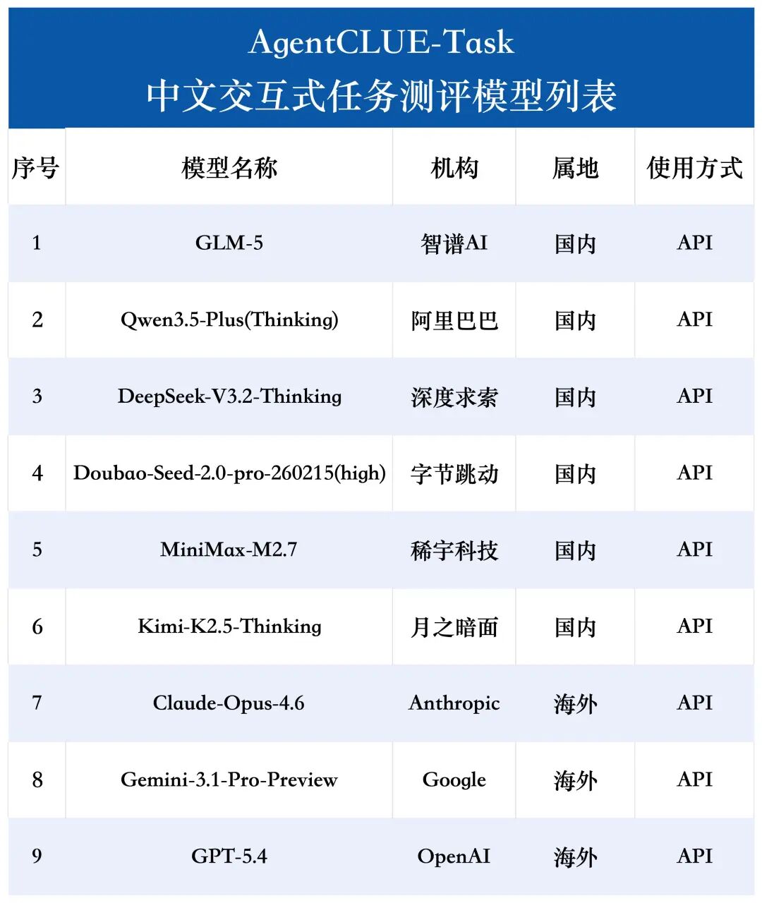 本次 AgentCLUE-Task 测评基准共测评了9个模型,包括6个国内模型,3个海外模型,以下是具体的测评模型列表: