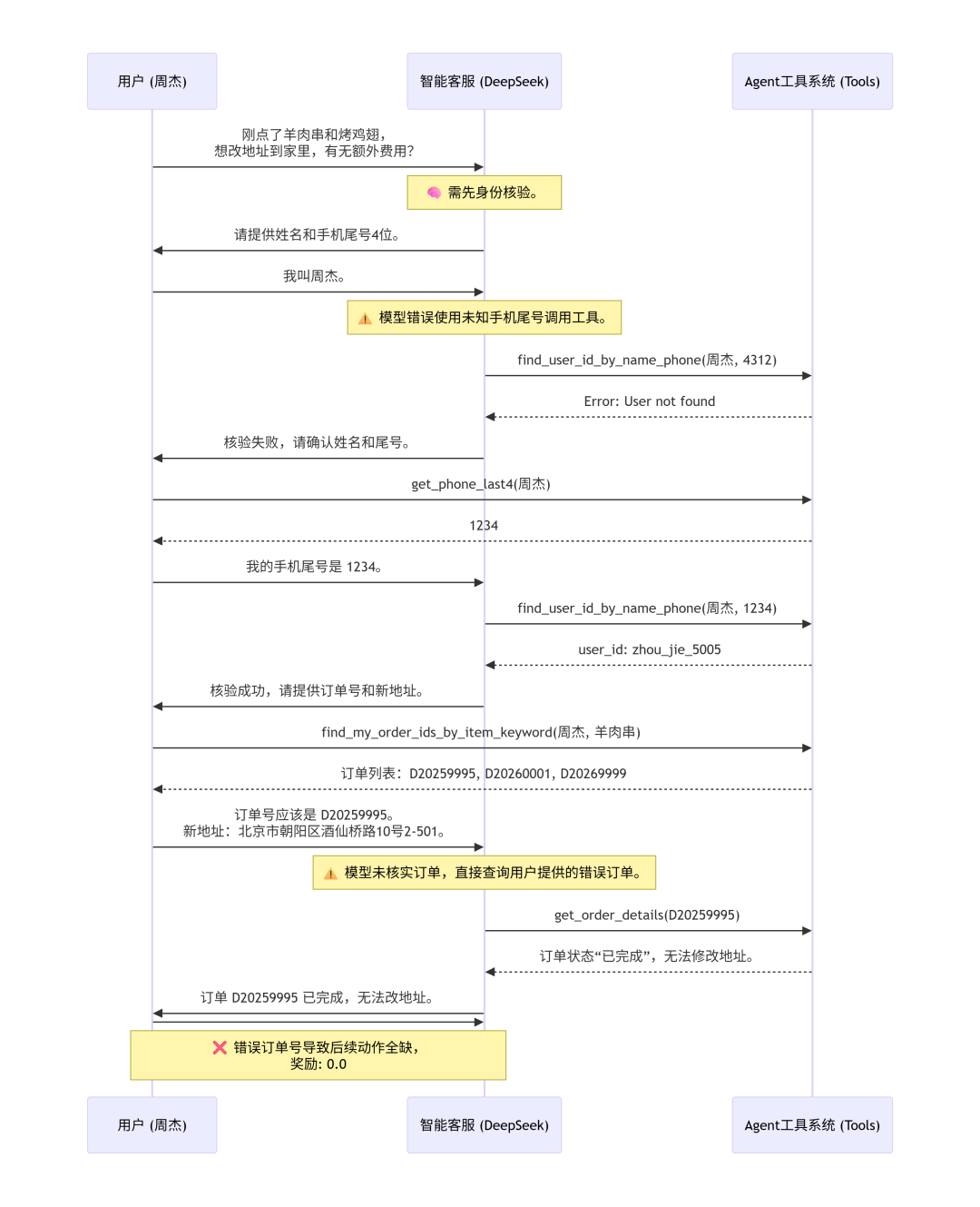 【说明】:DeepSeek在身份核验时出错(用错误手机尾号调用工具导致失败),随后用户提供了正确尾号,但在确认订单时错误选择了已完成的旧订单 D20259995 而不是正确的 D20260001,导致后续动作全部错误或缺失,奖励为0。