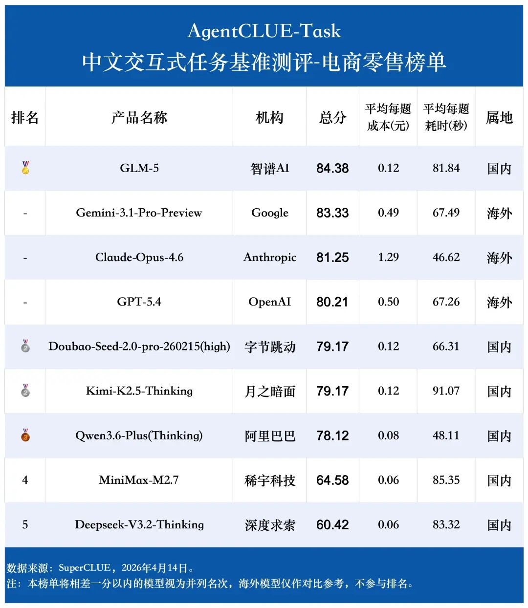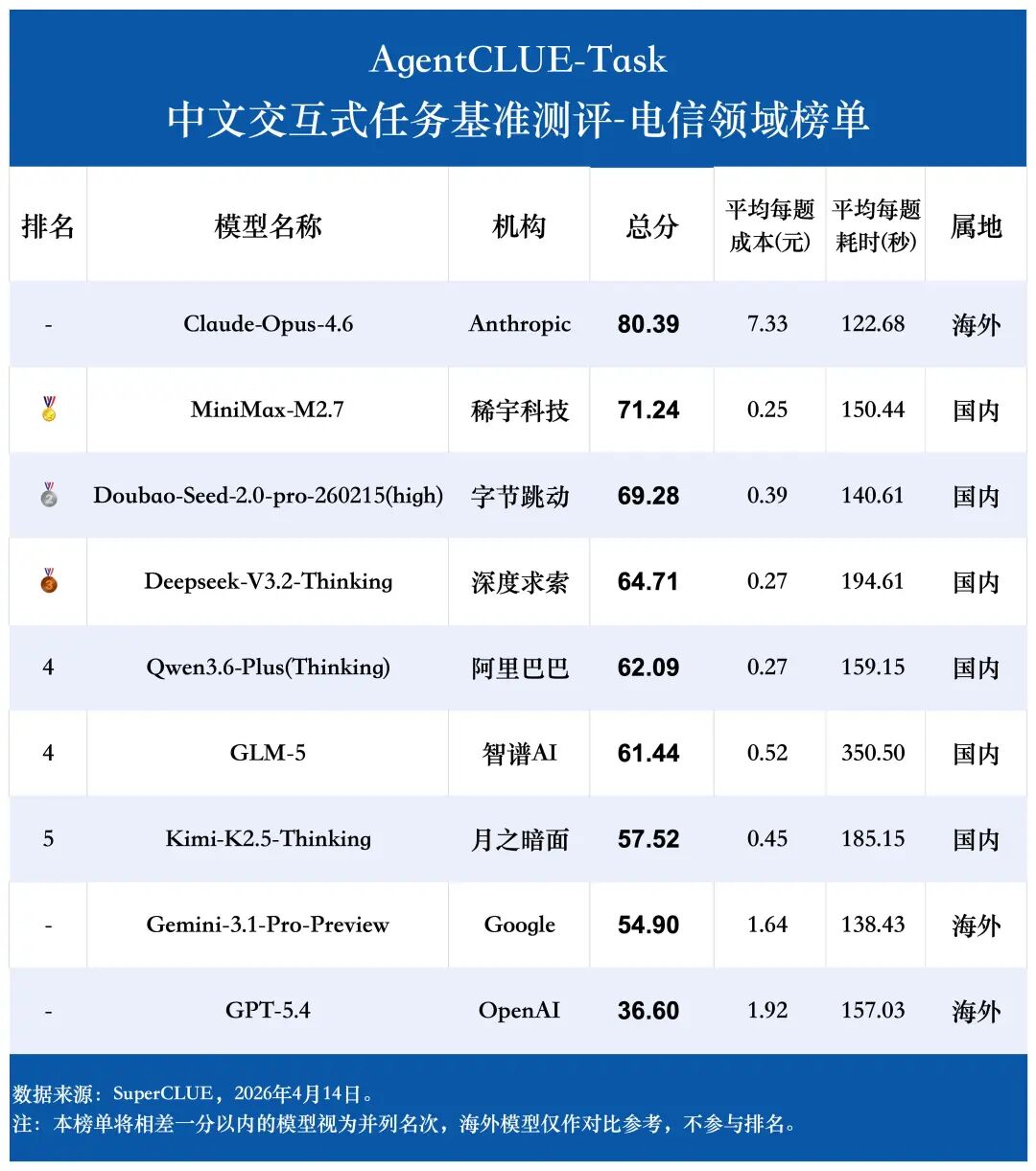 从模型表现看,Claude-Opus-4.6 在 电信领域 和 电商零售 两个领域表现很强,而且整体比较均衡,是最接近“通用强者”的模型。
