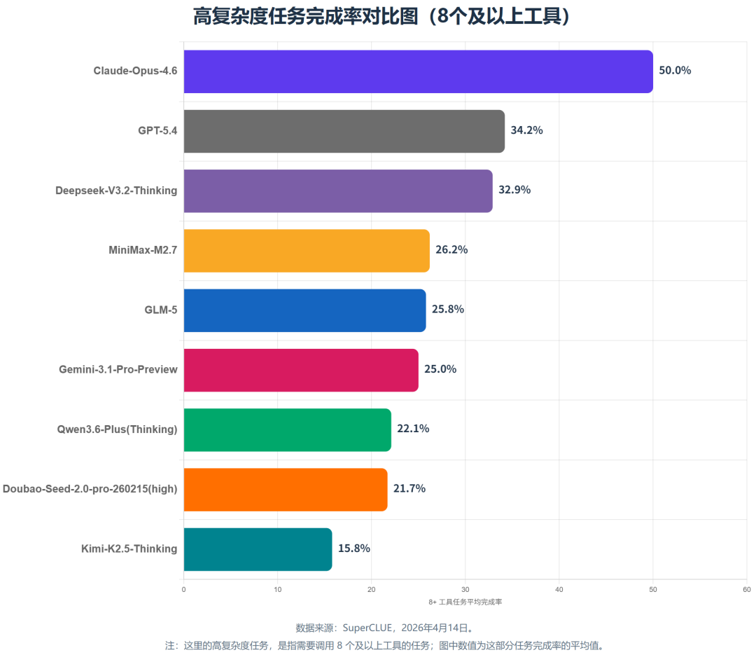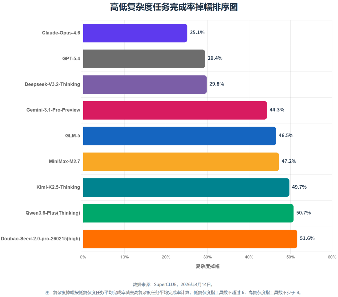 Claude-Opus-4.6 在高复杂度任务上明显更稳,GPT-5.4 和 DeepSeek-V3.2-Thinking 在长链路上韧性尚可,其他模型在复杂度上升后掉幅显著更大。