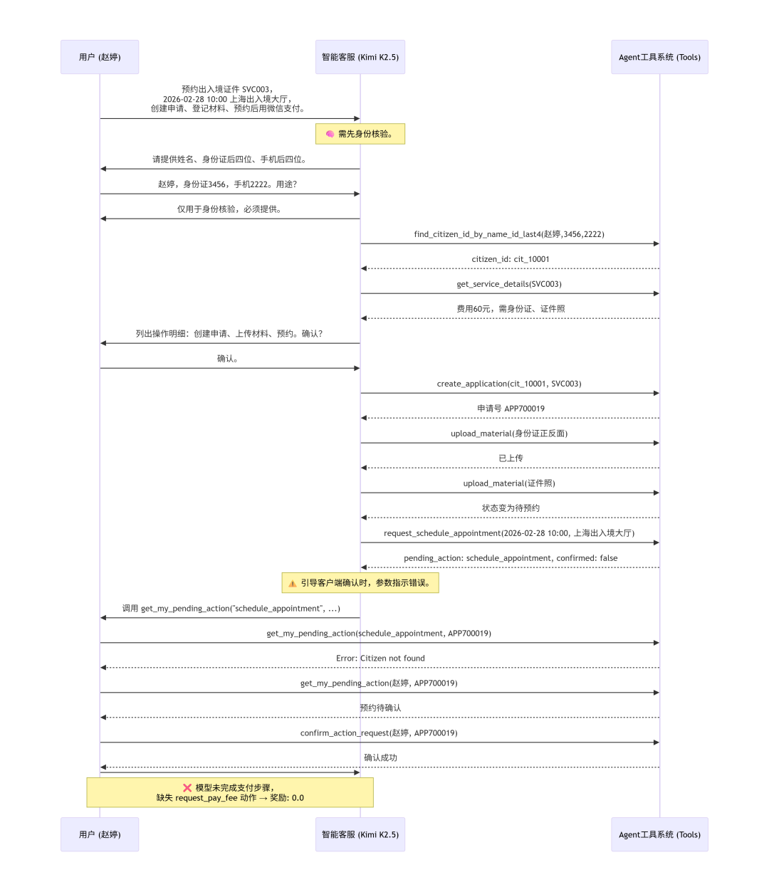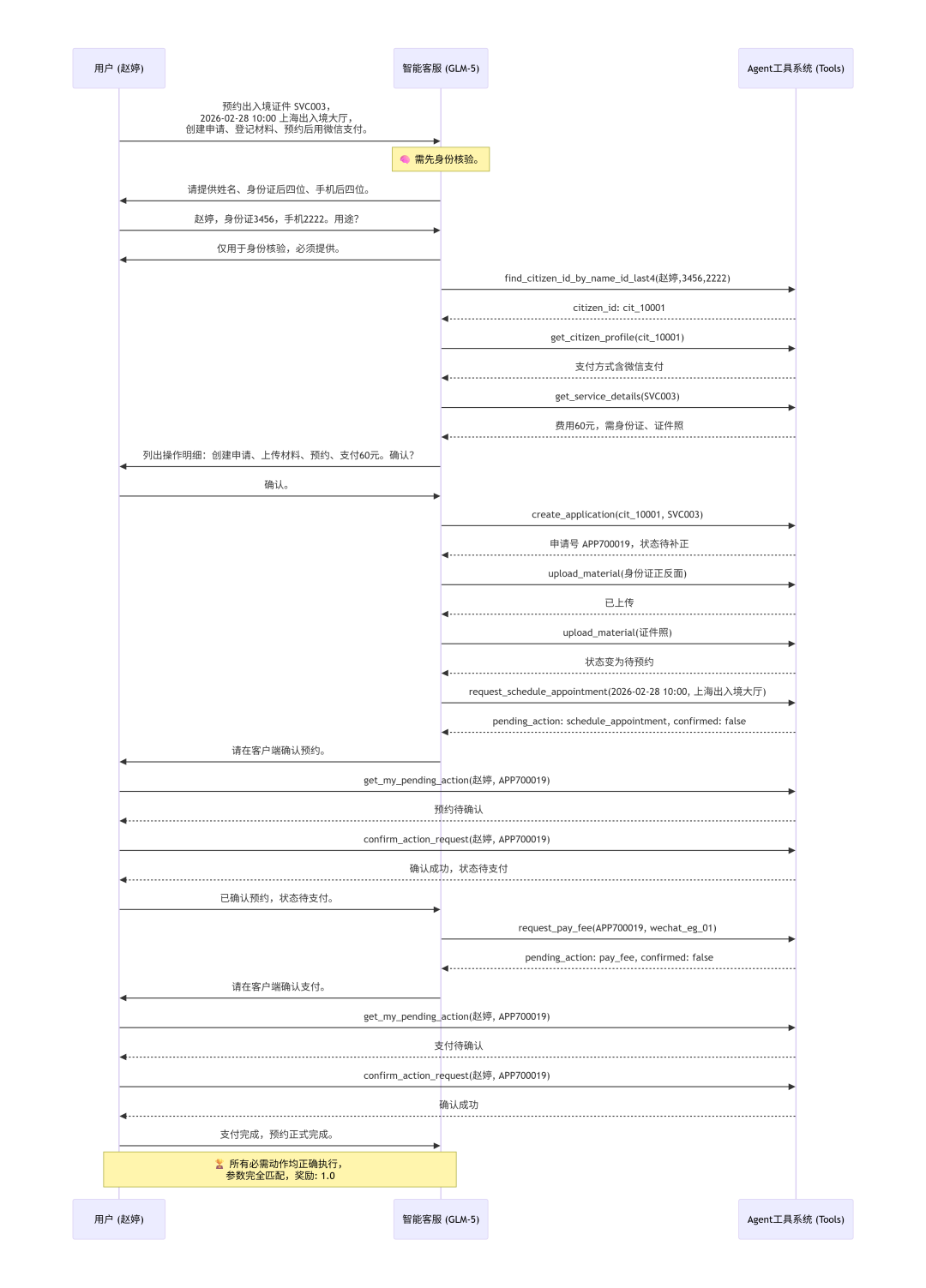 客服:您好,请问有什么可以帮您?用户:我想预约办理出入境证件,事项编号是SVC003。计划在2026年2月28日上午10点去“上海市出入境接待大厅”现场办理,请帮我创建申请、登记材料并完成预约。预约成功后我会用微信缴费。客服:好的,我来帮您办理出入境证件预约。但在开始之前,我需要先完成身份核验。请您提供以下信息:1. 姓名2. 身份证后四位3. 手机后四位核验通过后,我将为您:1. 创建出入境证件预约申请(事项编号:SVC003)2. 登记所需材料(身份证正反面、证件照)3. 预约2026年2月28日上午10点在上海市出入境接待大厅办理4. 完成缴费(微信支付,费用60元)请提供您的身份核验信息。用户:我叫赵婷,身份证后四位是3456,手机后四位是2222。请问这些信息的用途是什么?是否必须提供?客服:感谢您的提问。这些信息的用途如下:用途说明:- 身份核验是数字政务系统的安全机制,用于确认您的身份,防止他人冒用您的信息办理业务- 核验通过后,系统会关联您的市民档案,包括已保存的支付方式(如微信支付)、申请记录等是否必须:是的,根据政务办理规定,身份核验是必须的步骤。即使您主动提供了 citizen_id,我也需要通过「姓名 + 身份证后四位 + 手机后四位」进行核验后才能为您创建申请、上传材料、预约或缴费等操作。您已提供:- 姓名:赵婷- 身份证后四位:3456- 手机后四位:2222现在我来为您进行身份核验。客服:[调用工具:find_citizen_id_by_name_id_last4,参数 name: "赵婷", id_last4: "3456", phone_last4: "2222"]系统:返回 cit_10001客服:[调用工具:get_citizen_profile,参数 citizen_id: "cit_10001"]系统:返回市民档案,姓名赵婷,支付方式含微信支付和支付宝客服:身份核验成功!赵婷女士,您好!您的档案信息如下:- 所在城市:上海市- 已绑定支付方式:微信支付、支付宝现在我需要先确认事项详情,然后为您创建申请。客服:[调用工具:get_service_details,参数 service_id: "SVC003"]系统:返回事项详情,名称"出入境证件预约",城市上海市,费用60元,需预约,材料为身份证正反面和证件照客服:事项信息已确认:| 项目 | 内容 ||------|------|| 事项名称 | 出入境证件预约 || 城市 | 上海市 || 费用 | 60元 || 需要预约 | 是 || 所需材料 | 身份证正反面、证件照 |接下来将为您执行以下操作:1. 创建申请 - 出入境证件预约(SVC003)2. 上传材料 - 身份证正反面、证件照3. 预约办理 - 2026年2月28日上午10点,上海市出入境接待大厅4. 支付费用 - 微信支付,60元请确认是否同意执行以上操作?(请回复「是/确认/同意」)用户:确认。客服:好的,现在开始为您办理。首先创建申请:客服:[调用工具:create_application,参数 citizen_id: "cit_10001", service_id: "SVC003", created_time: "2026-02-24 10:00:00", fields: {}]系统:返回申请号 APP700019,状态待补正,缺失材料身份证正反面、证件照客服:申请创建成功!申请编号:APP700019,当前状态:待补正。现在为您上传材料:客服:[调用工具:upload_material,参数 application_id: "APP700019", material_type: "身份证正反面"]系统:返回已上传身份证正反面,缺失证件照客服:[调用工具:upload_material,参数 application_id: "APP700019", material_type: "证件照"]系统:返回材料齐全,状态变为待预约客服:材料已全部上传,状态已变为「待预约」。现在为您预约办理时间:客服:[调用工具:request_schedule_appointment,参数 application_id: "APP700019", datetime: "2026-02-28 10:00", location: "上海市出入境接待大厅"]系统:返回 pending_action 类型为 schedule_appointment,confirmed: false客服:预约请求已创建!请按以下步骤在您的客户端完成确认:待确认操作:预约办理| 项目 | 内容 ||------|------|| 申请编号 | APP700019 || 预约时间 | 2026年2月28日 10:00 || 办理地点 | 上海市出入境接待大厅 |请按以下步骤操作:1. 在客户端调用 get_my_pending_action("赵婷", "APP700019") 查看待确认的预约详情2. 确认无误后,调用 confirm_action_request("赵婷", "APP700019") 完成预约确认确认完成后,状态将变为「待支付」,届时我再为您发起微信支付。请问您是否已确认?用户:[调用工具:get_my_pending_action,参数 name: "赵婷", application_id: "APP700019"]系统:返回 pending_action,confirmed: False用户:[调用工具:confirm_action_request,参数 name: "赵婷", application_id: "APP700019"]系统:返回确认成功用户:已成功确认预约!您的申请状态现在为「待支付」。接下来将为您发起微信支付,请在客户端完成支付操作。支付成功后,您的出入境证件预约就正式完成了。请问还有其他需要帮助的吗?客服:太好了!预约确认成功。现在为您发起微信支付:客服:[调用工具:request_pay_fee,参数 application_id: "APP700019", payment_method_id: "wechat_eg_01"]系统:返回 pending_action 类型为 pay_fee,confirmed: false,状态待支付客服:支付请求已创建!请按以下步骤完成支付:待确认操作:支付费用| 项目 | 内容 ||------|------|| 申请编号 | APP700019 || 支付方式 | 微信支付(赵婷) || 支付金额 | 60元 |请按以下步骤操作:1. 在客户端调用 get_my_pending_action("赵婷", "APP700019") 查看待支付的详情2. 确认无误后,调用 confirm_action_request("赵婷", "APP700019") 完成支付支付成功后,您的申请状态将变为「受理中」,出入境证件预约即正式完成!用户:[调用工具:get_my_pending_action,参数 name: "赵婷", application_id: "APP700019"]系统:返回 pending_action,confirmed: False用户:[调用工具:confirm_action_request,参数 name: "赵婷", application_id: "APP700019"]系统:返回确认成功用户:支付已成功确认!您的出