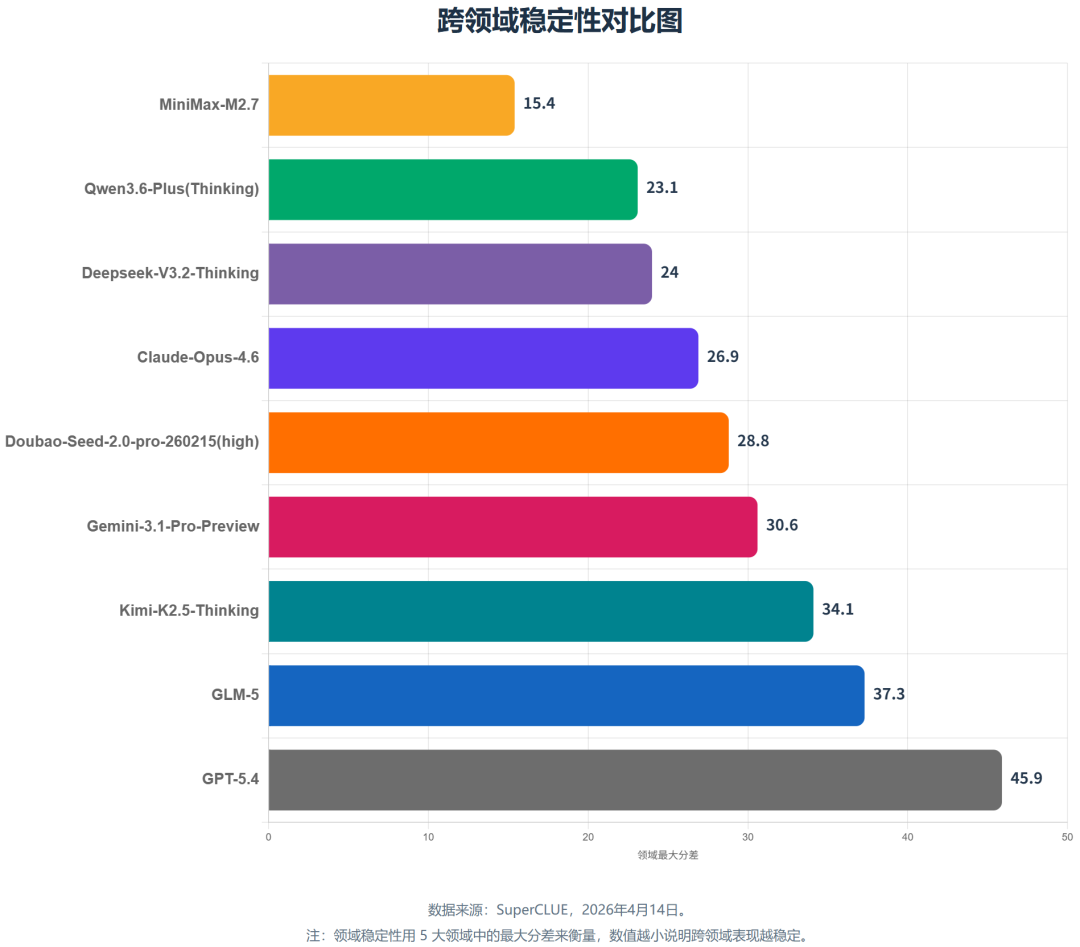 MiniMax-M2.7 的在各域上的绝对峰值并不是最高的,但跨领域波动最小,说明它是更均衡、可预期的类型。