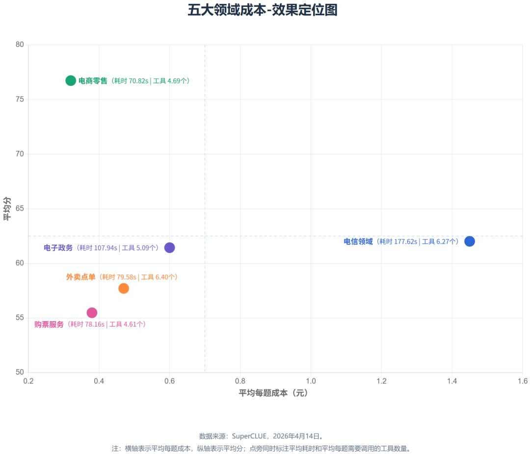 电信领域(telecom)则是复杂度最高的任务域:平均成本最高(平均每题花费 1.45 元)、耗时最长(平均每题耗时 177.62 秒)、工具数(平均每题调用 6.27 个工具)也较高,但得分(62.02)并没有显著领先,说明这是一个高投入但不一定高产出的复杂领域。