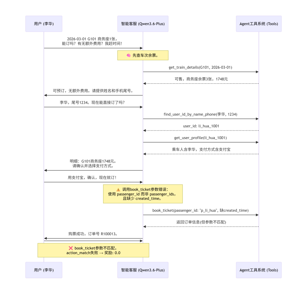 【说明】:Qwen3.6-Plus 调用 book_ticket 时参数错误(使用 passenger_id 而非 passenger_ids,且缺少 created_time)