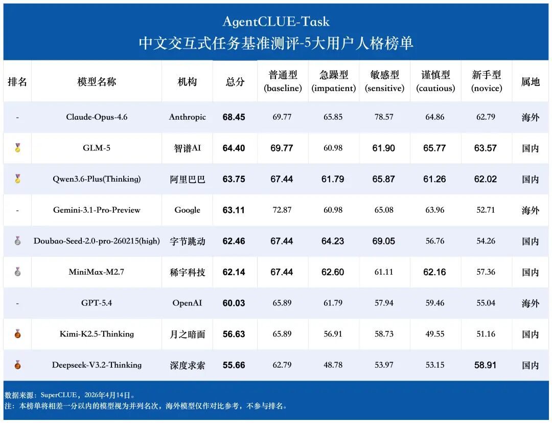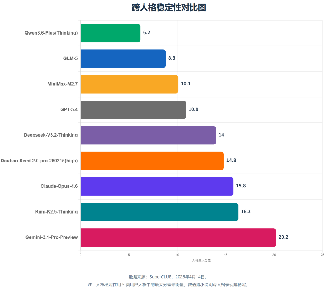 Qwen3.6-Plus(Thinking) 和 GLM-5 是跨人格最稳定的两个模型,说明它们对用户表达风格的鲁棒性较好。