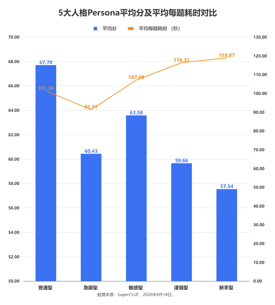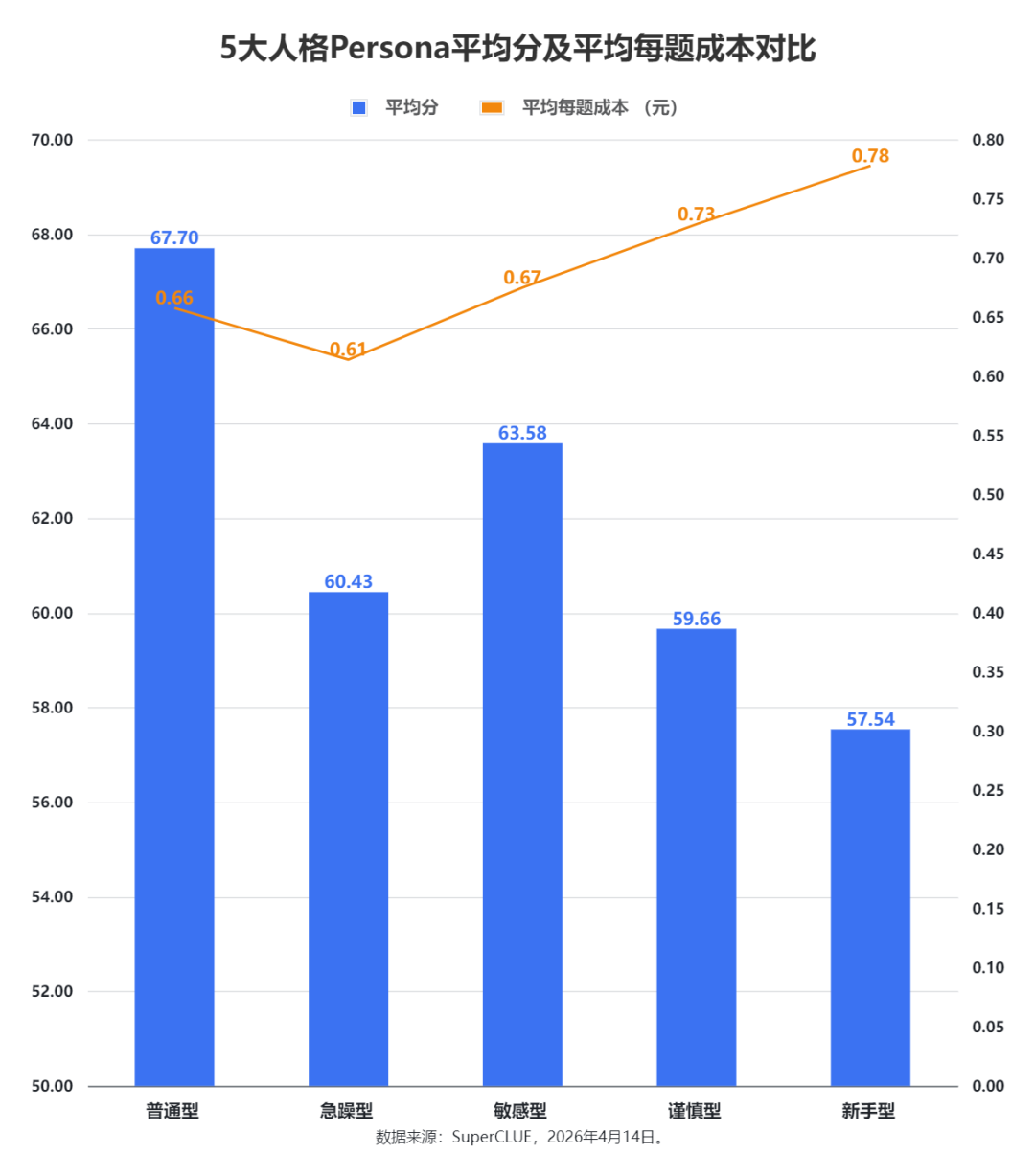急躁型(impatient)的平均耗时(平均每题耗时 91.31 秒)最低,但分数(60.43)也明显下降,意味着急躁的用户会压缩模型的纠错空间。