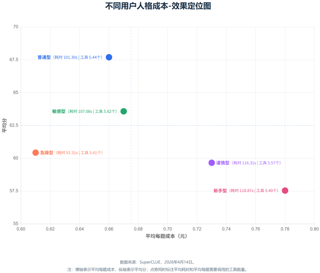谨慎型(cautious)也偏难,且成本(平均每题花费 0.73 元)和耗时(平均每题耗时 116.31 秒)都不低,说明这类用户可能会引入更多确认和反复校验,使模型在流程上付出更多代价。