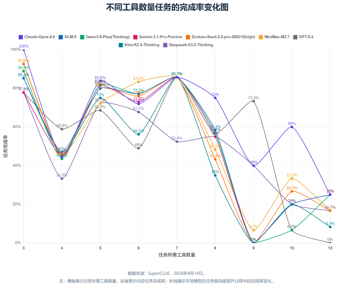 当任务的工具数量不超过 6 个时,多数模型还能维持一定的完成率,但工具数量不少于 8 个时,模型之间的掉幅开始显著分化。Claude-Opus-4.6是高复杂度任务上最稳的模型,8+ 工具任务的平均完成率仍然处于领先位置。相对而言,其他模型在高复杂度任务中的下降更明显。