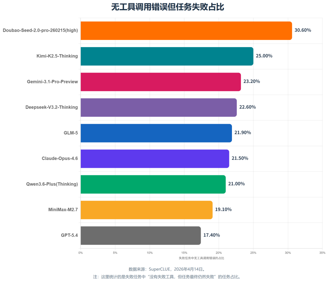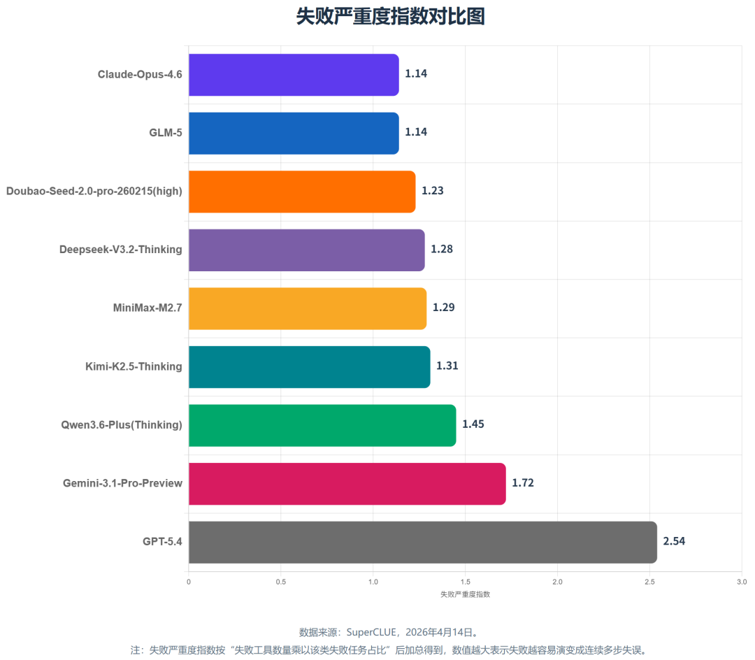 从下方的失败严重度指数对比图可以看出:Claude-Opus-4.6 和 GLM-5 的失败严重度更低,仅有1.14,说明这两个模型即使任务失败,也更像个别工具调用出错,不会影响整体的工具调用及后续任务演进方向;Doubao-Seed-2.0-pro(high)、DeepSeek-V3.2-Thinking、MiniMax-M2.7等模型的严重度指数均在2.0以下,相对 GPT-5.4 而言表现较为稳定。GPT-5.4 的失败严重度指数则明显更高,说明它一旦偏航,更容易出现多步连续失误。