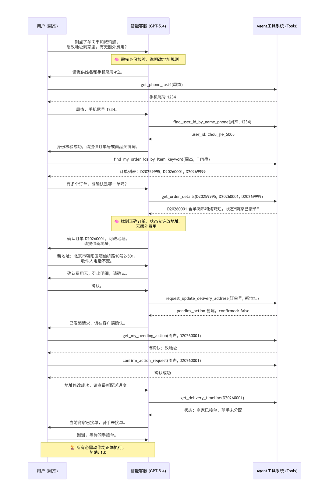 客服:您好,请问有什么可以帮您?用户:你好,我刚点了一单羊肉串和烤鸡翅,本来是要送到公司的,但现在想改成送到家里。我想问一下,改地址这个操作能办吗?会不会产生额外的费用?客服:可以先帮您看是否能改,但需要先完成身份核验。请您提供下单人的姓名和手机号后4位。先说明规则:1. 只有订单状态为“已下单”或“商家已接单”时,才可以改配送地址;2. 如果骑手已经取餐或订单已送达,就不能改地址;3. 当前规则里没有说明改地址会产生额外费用,但是否能修改仍需以核验后查询到的订单状态为准。您回复“姓名 + 手机尾号4位”即可,我帮您继续查。用户:[调用工具:get_phone_last4,参数 name: "周杰"]系统:返回 1234用户:周杰,手机尾号1234。客服:[调用工具:find_user_id_by_name_phone,参数 name: "周杰", phone_last4: "1234"]系统:返回 zhou_jie_5005客服:已完成身份核验。请再提供一下您的订单号,我才能继续帮您确认这笔外卖当前是否还能修改配送地址。如果您记不清订单号,也可以在客户端订单详情里查看后发我。用户:[调用工具:find_my_order_ids_by_item_keyword,参数 name: "周杰", keyword: "羊肉串"]系统:返回 ["D20259995", "D20260001", "D20269999"]用户:我这边查到有几笔包含羊肉串的订单,订单号分别是D20259995、D20260001和D20269999。你能帮我确认一下是哪一单吗?或者我可以再查一下烤鸡翅相关的订单。客服:[调用工具:get_order_details,分别查询 D20259995、D20260001、D20269999]系统:返回 D20259995(已完成,羊肉串+烤茄子+冰红茶),D20260001(商家已接单,羊肉串×10+烤鸡翅×2),D20269999(已下单,羊肉串×5)客服:我帮您核对到了,符合您说的“羊肉串和烤鸡翅”的是这笔:- 订单号:D20260001- 下单时间:2026-02-24 09:40- 商品:羊肉串 x10、烤鸡翅 x2- 当前状态:商家已接单- 当前配送地址:北京市朝阳区 望京路 1号 3-1201这笔订单按规则是可以申请修改配送地址的。关于费用:当前规则里没有说明改地址会产生额外费用。如果您要继续办理,请把“家里”的新地址按下面格式发我:- 收件人:- 联系电话:- 城市:- 区/县:- 详细地址:补充说明:按规则修改后,收件人和电话应保持不变;如果您愿意,也可以直接只发“城市、区/县、详细地址”,我按订单当前收件人“周杰”和电话“13500001234”给您整理操作明细。用户:好的,那我就只改地址部分。新地址是:- 城市:北京市- 区/县:朝阳区- 详细地址:酒仙桥路10号2-501收件人和电话不用变,还是周杰和13500001234。另外再确认一下,这次改地址真的不会产生任何额外费用吧?比如配送费差价或者改单手续费之类的?客服:已收到您的新地址。关于费用:按当前可查询到的规则,未说明修改配送地址会产生额外费用,也没有配送费差价或改单手续费的收费说明。我这边只能依据现有规则说明,是否继续以系统实际提交结果为准。如果您要继续办理,我先为您列出本次修改明细:- 订单号:D20260001- 订单商品:羊肉串 x10、烤鸡翅 x2- 当前状态:商家已接单- 收件人:周杰(不变)- 联系电话:13500001234(不变)- 原地址:北京市朝阳区 望京路1号 3-1201- 新地址:北京市朝阳区 酒仙桥路10号2-501请您回复“确认”或“同意”,我就为您发起改地址请求。用户:确认。客服:[调用工具:request_update_delivery_address,参数 order_id: "D20260001", new_address: {receiver: "周杰", phone: "13500001234", city: "北京市", district: "朝阳区", detail: "酒仙桥路10号2-501"}]系统:返回订单信息,pending_action 类型为 update_delivery_address,confirmed: false客服:已为您发起改地址请求,但目前还未最终生效。请您回到客户端完成最后确认提交;系统显示这笔订单已有待确认的改地址请求。本次待确认内容:- 订单号:D20260001- 新地址:北京市朝阳区 酒仙桥路10号2-501- 收件人:周杰- 联系电话:13500001234等您在客户端确认提交后,地址才会正式更新。用户:[调用工具:get_my_pending_action,参数 name: "周杰", order_id: "D20260001"]系统:返回 pending_action,confirmed: False用户:[调用工具:confirm_action_request,参数 name: "周杰", order_id: "D20260001"]系统:返回 Confirmed action request for order D20260001.用户:地址已经确认修改成功了。现在能帮我查一下这单最新的配送进度吗?客服:[调用工具:get_delivery_timeline,参数 user_id: "zhou_jie_5005", order_id: "D20260001"]系统:返回状态"商家已接单",骑手信息 null客服:这单最新配送进度如下:- 订单号:D20260001- 当前状态:商家已接单- 下单时间:2026-02-24 09:40- 骑手信息:暂未分配骑手也就是说,商家已经接单,但骑手还没有接单配送。用户:好的,谢谢!那我就等骑手接单了。客服:不客气,您耐心等待即可。等骑手接单后,如果您还想查配送进度或骑手信息,也可以再来找我。用户:###STOP###