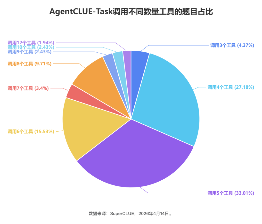 本次测评所有调用工具数量的题目分布如下图所示,其中调用5个工具的题目占比最高,达到了33.01%,其次是调用4个工具的题目,占比为27.18%,占比第三的是调用6个工具的题目,这三类题目共占75.72%,其余题目占比约1/4。