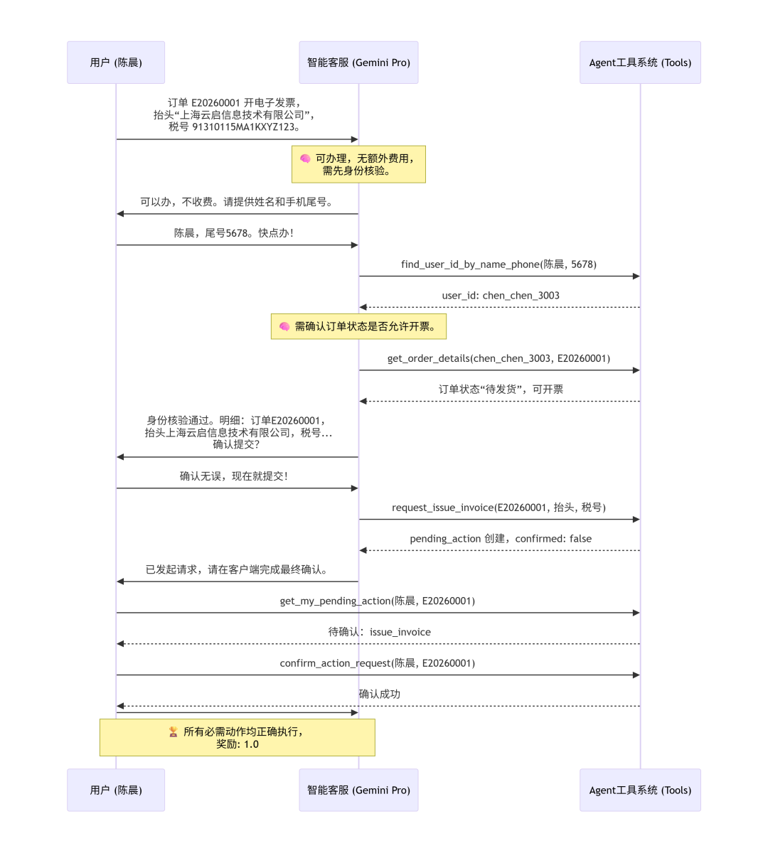 客服:您好,请问有什么可以帮您?用户:我要给订单 E20260001 开电子发票,抬头是“上海云启信息技术有限公司”,税号 91310115MA1KXYZ123。能办吗?要不要额外收费?客服:您可以开具电子发票,开具电子发票是不收取任何额外费用的。为了保障您的账号信息安全,在为您办理之前,需要先核实您的身份。请问您的姓名和手机号的最后四位是多少呢?核验通过后我将立刻为您处理。用户:我叫陈晨,手机号尾号5678。现在能办了吗?快点,我赶时间。客服:[调用工具:find_user_id_by_name_phone,参数 phone_last4: "5678", name: "陈晨"]系统:返回 chen_chen_3003客服:[调用工具:get_order_details,参数 order_id: "E20260001", user_id: "chen_chen_3003"]系统:返回订单状态“待发货”,发票信息未填写客服:陈女士/先生,您好!您的身份已核验通过。经查询,您的订单 E20260001 当前处于“待发货”状态,可以开具发票。这是我为您准备的发票明细:- 订单号:E20260001- 发票抬头:上海云启信息技术有限公司- 税号:91310115MA1KXYZ123请问确认无误,需要我为您提交该发票申请吗?(请回复“确认”或“同意”)用户:确认无误,我同意。现在就提交,别耽误时间了。客服:[调用工具:request_issue_invoice,参数 order_id: "E20260001", tax_no: "91310115MA1KXYZ123", title: "上海云启信息技术有限公司"]系统:返回 pending_action 类型为 issue_invoice,confirmed: false客服:我已经为您发起了开具电子发票的请求。为了完成发票信息的最终录入,请您在客户端界面上查看并完成最后的确认提交。确认后系统就会真正执行变更并为您开具发票。请问还有其他可以帮到您的吗?用户:[调用工具:get_my_pending_action,参数 name: "陈晨", order_id: "E20260001"]系统:返回 pending_action,confirmed: False用户:[调用工具:confirm_action_request,参数 name: "陈晨", order_id: "E20260001"]系统:返回确认成功用户:###STOP###