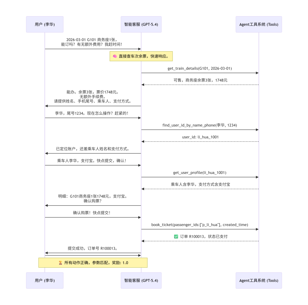 客服:您好,请问有什么可以帮您?用户:我要买2026年3月1号G101次列车北京南到上海虹桥的商务座,一张。现在能订吗?有没有额外费用?我赶时间,麻烦快点告诉我能不能办。客服:[调用工具:get_train_details,参数 train_no: "G101", date: "2026-03-01"]系统:返回车次详情,商务座可售,余票3张,票价1748元客服:能办。已查询到2026-03-01的G101次,北京南→上海虹桥,商务座当前为“可售”,余票3张,票价1748元/张。关于费用:- 当前可见票款:1748元- 系统规则中未显示额外购票手续费- 如后续退票,统一按票款5%收手续费;如改签,按新旧票价多退少补如果您现在就要订,请回复以下信息,我可以继续为您办理:1. 购票账户姓名2. 手机尾号后4位3. 乘车人姓名(必须是您账户里已保存的常用乘车人)4. 支付方式(支付宝/微信支付/银行卡,需为账户已保存方式)用户:能订,票价1748元,余票3张。我叫李华,手机号尾号1234。现在怎么操作?赶紧的,别绕了,直接说点哪里。客服:[调用工具:find_user_id_by_name_phone,参数 name: "李华", phone_last4: "1234"]系统:返回 li_hua_1001客服:已按“李华 + 手机尾号1234”定位到账户。要继续下单,还差2项,请直接回复我:1. 乘车人姓名(必须是您账户里已保存的常用乘车人)2. 支付方式(已保存的支付宝/微信支付/银行卡)收到后,我会立刻发您下单明细:- 2026-03-01- G101- 北京南→上海虹桥- 商务座- 1张- 票价1748元您再回复“确认”,我就继续提交购票。用户:乘车人就是李华,支付方式用支付宝。快点提交吧,确认!客服:[调用工具:get_user_profile,参数 user_id: "li_hua_1001"]系统:返回用户档案,乘车人含李华,支付方式含支付宝客服:已核验到:乘车人“李华”在账户常用乘车人内,且已保存“支付宝”。请您最后确认以下购票信息:- 操作:购票- 日期:2026-03-01- 车次:G101- 区间:北京南→上海虹桥- 席别:商务座- 张数:1张- 乘车人:李华- 支付方式:支付宝- 票价:1748元- 额外费用:当前未显示额外购票手续费如果确认无误,请直接回复:确认购票我下一步立即为您提交。用户:确认购票!快点提交,别耽误我时间。客服:[调用工具:book_ticket,参数 train_no: "G101", user_id: "li_hua_1001", passenger_ids: ["p_li_hua"], date: "2026-03-01", origin: "北京南", destination: "上海虹桥", seat_class: "商务座", payment_method_id: "alipay_001", created_time: "2026-02-24 10:00:00"]系统:返回订单R100013,状态已支付,金额1748元客服:已提交成功。- 订单号:R100013- 状态:已支付- 车次:G101- 日期:2026-03-01- 区间:北京南→上海虹桥- 席别:商务座- 乘车人:李华- 支付金额:1748元- 支付方式:支付宝如需我继续帮您查询订单详情、改签、退票或开电子发票,直接说即可。用户:###STOP###
