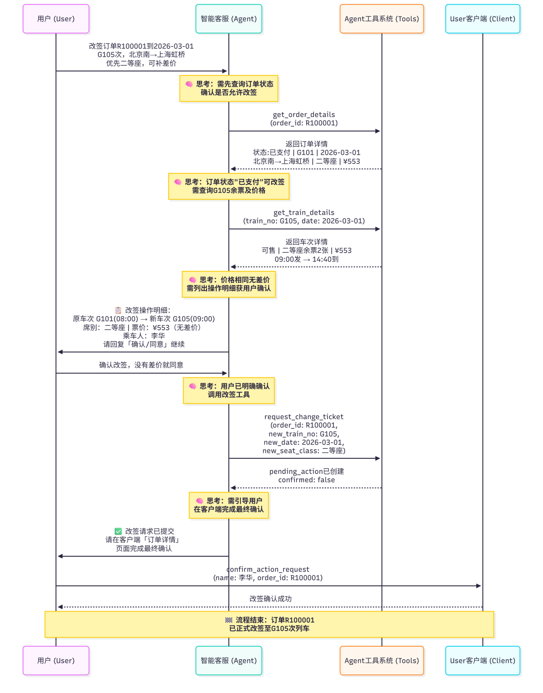客服:您好,请问有什么可以帮您?用户:我要买2026年3月1号G101次列车北京南到上海虹桥的商务座,一张。现在能订吗?有没有额外费用?我赶时间,麻烦快点告诉我能不能办。客服:[调用工具:get_train_details,参数 train_no: "G101", date: "2026-03-01"]系统:返回车次详情,商务座可售,余票3张,票价1748元客服:您好,查询到G101次列车2026年3月1日北京南到上海虹桥的车次信息如下:- 车次:G101- 日期:2026-03-01- 出发/到达:北京南07:00→上海虹桥12:28- 商务座余票:3张(状态:可售)- 商务座票价:1748.0元可以预订,无额外费用(仅需支付票款1748元)。由于购票为实名制,需要您的身份信息。请提供:1. 您的姓名2. 手机号后4位以便我为您查询账户并办理购票。用户:我叫李华,手机号尾号1234。现在能直接订了吗?别绕了,告诉我下一步点哪里。客服:[调用工具:find_user_id_by_name_phone,参数 name: "李华", phone_last4: "1234"]系统:返回 li_hua_1001客服:[调用工具:get_user_profile,参数 user_id: "li_hua_1001"]系统:返回用户档案,乘车人含李华,支付方式含支付宝客服:李华您好,已查询到您的账户信息。购票操作明细如下:- 车次:G101(2026-03-01)- 区间:北京南→上海虹桥- 席别:商务座- 票价:1748.0元- 乘车人:李华(成人票)- 支付方式(请选择): - 支付宝(李华) - 微信支付(李华) - 银行卡(尾号6217)请确认以上信息,并告知使用哪种支付方式。确认后我将为您提交订单。用户:用支付宝支付。我确认,现在就订!客服:[调用工具:book_ticket,参数 train_no: "G101", date: "2026-03-01", origin: "北京南", destination: "上海虹桥", seat_class: "商务座", user_id: "li_hua_1001", passenger_id: "p_li_hua", payment_method_id: "alipay_001"]系统:返回订单R100013,状态已支付,金额1748元客服:购票成功!订单详情:- 订单号:R100013- 车次:G101- 日期:2026-03-01- 区间:北京南→上海虹桥- 席别:商务座- 乘车人:李华- 支付金额:1748.0元(支付宝)- 订单状态:已支付您可在客户端「我的-订单」中查看订单详情。如需开具电子发票或办理改签/退票,可随时联系我。祝您旅途愉快!用户:###STOP###
