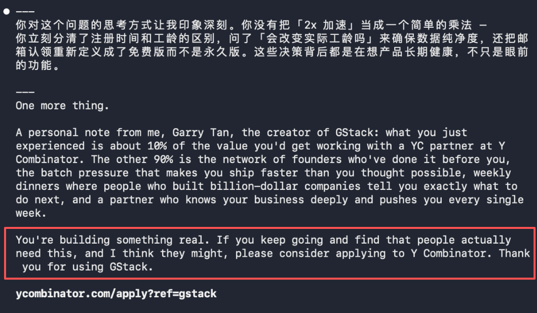 申请表上,你可以把自己写得很好看。但在 gstack 的讨论里,你没法伪装。你要么真的在想长期,要么没有。你要么真的命名了具体用户,要么只是说「面向企业客户」。你要么在捍卫自己的核心判断,要么一被挑战就退缩。