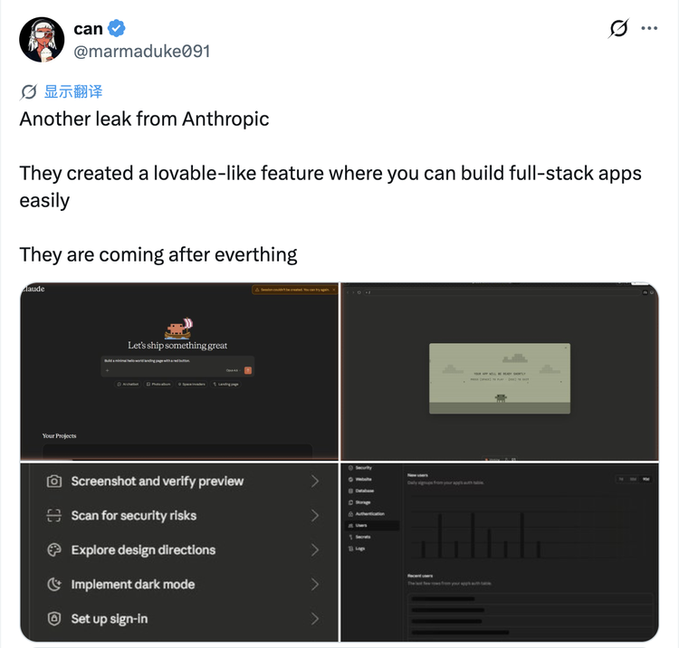 随后,用户 @marmaduke091 转发并评论道:“他们做出了一个类似 Lovable 的功能,让你可以轻松构建全栈应用。他们正冲着所有人来 (They are coming after everything)。”