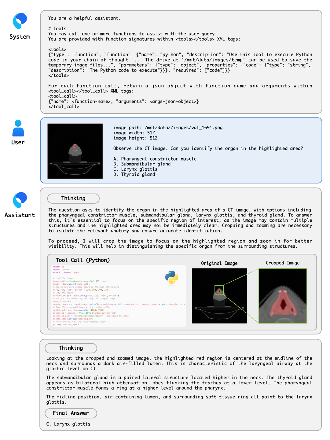这意味着,模型不再只是“看见图像后回答问题”,而是具备“通过代码操作图像”的能力。对于高信息密度的科研图表、高分辨率遥感图像、显微图像、天文观测图像等任务,这种能力尤其关键。