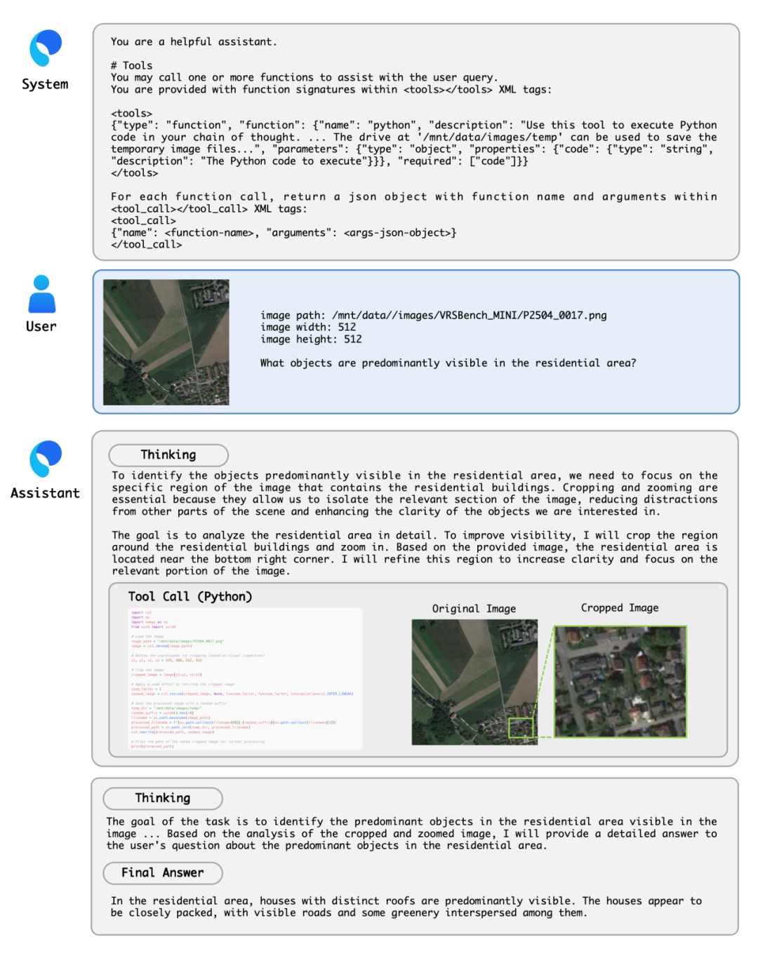 面对同时包含农田、道路与居民区的遥感图像,模型先定位问题所指向的住宅区域,再通过裁剪与放大聚焦目标区域,最终准确判断出该区域中主要可见的是房屋,并识别出其中还分布有道路和少量绿化。