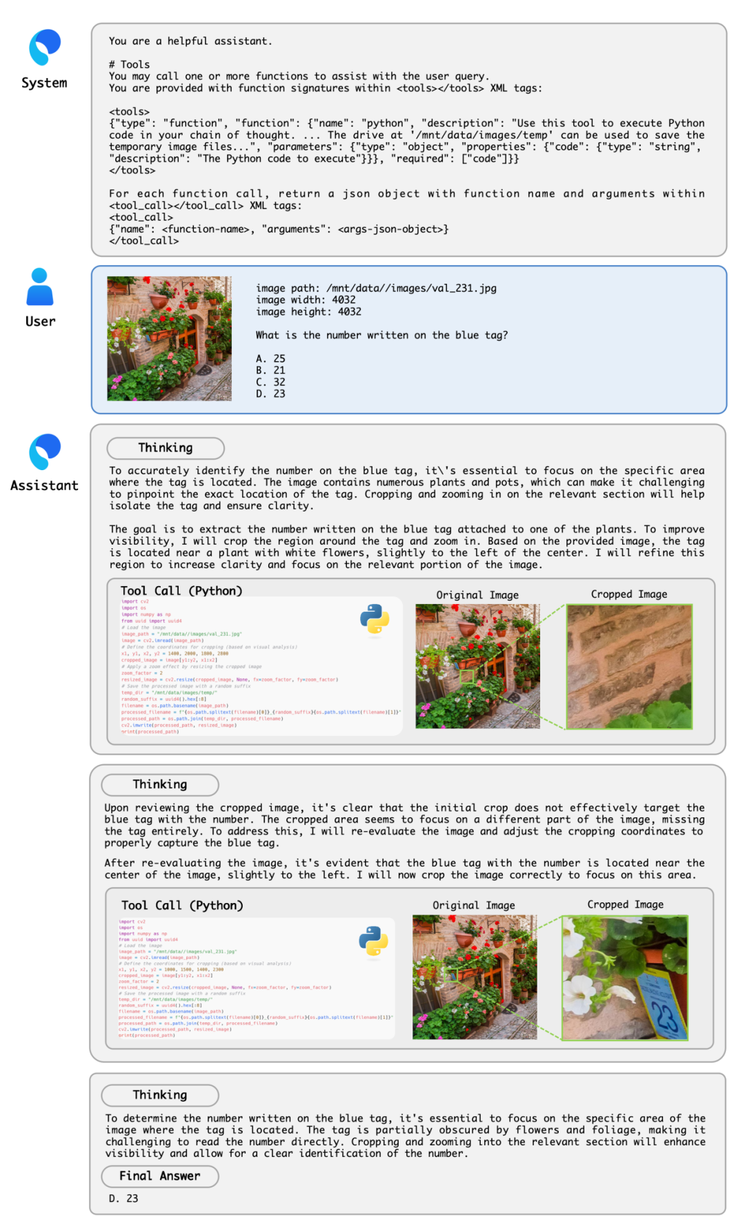 即模型可在推理过程中主动调用代码工具,对图像进行裁剪、放大、增强、框选与关键点标注等操作,结合局部信息完成后续推理。