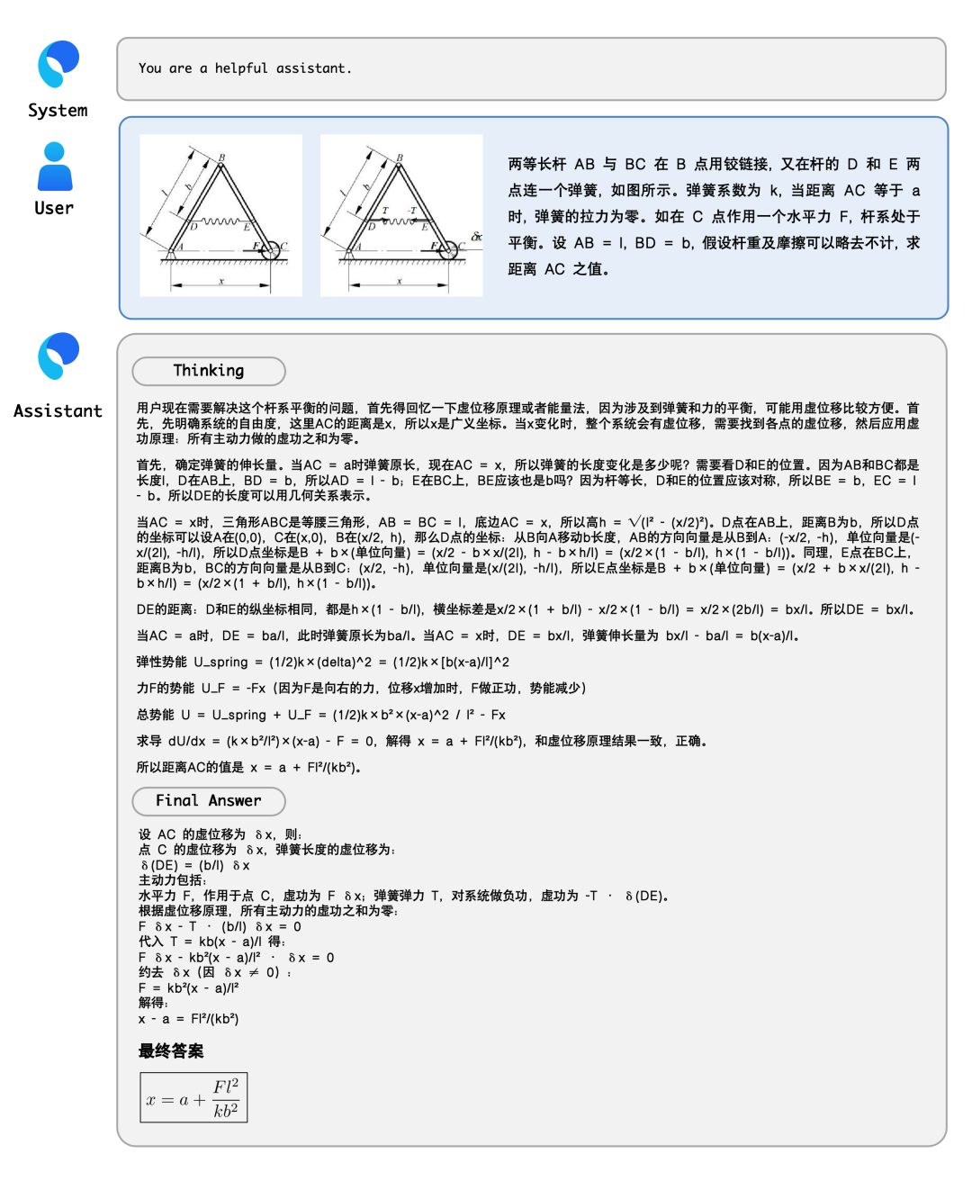 面对包含力学示意图与中文题干的复杂问题,模型能够同时理解图示结构、文字条件与变量关系,完成公式推导并给出结果 x = a + Fl² / kb²。