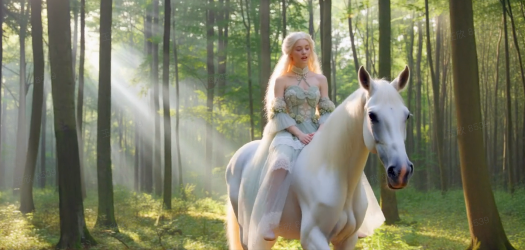 再加入背景音乐及人物对白的提示词,即可输出电影级片段——少女骑着骏马在林间小径缓步前行,温暖且空灵的音乐与森林的宁静氛围完美相融。