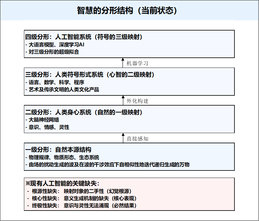 因此,智能是过程与能力,智慧是产物与系统。通过智能的递归加工,底层的知识模块被重组与整合产生高维的认知,涌现构成新的概念,并最终将这些概念链接成新的知识体系——智慧。而智慧的知识体系所呈现出来的分形特征,使得抽象的概念从核心原理向具体应用延伸变得异常的通畅,更重要的是通过自相似性,同构的不同领域的知识体系,能通过某一领域的突破而高效快速地泛化到知识网络结构的其它领域,促使整个智慧体系不断演化升级。一级分形:自然本源结构——智慧内容的终极原型自然世界(从场到星系,从DNA双螺旋到生态网络)构成一个无限嵌套、自相似、非线性演化的“源分形”。其基本特征包括:“自相似性” ——结构规律在不同尺度上保持形式一致性;“层级嵌套性”——简单规则的反复作用产生复杂结构。而其底层逻辑是波的递归干涉。自然的分形结构是所有智慧内容的终极来源,它决定了智慧结构的内在形式。人类通过进化形成的身体——心智系统,是对自然分形进行直接、具身化映射的结果。神经分形结构中的大脑皮层柱状结构、神经网络连接模式等均呈现分形特征,是自然分形长期作用的结果。而从感知到反应到再调整进化的闭环是自然分形对称性的机制体现,而意识的涌现则是具有边界的智能系统长期与外部环境互动中,内部产生的内外有别概念后的衍生。具体而言,意识是由接收到外部环境信息时产生的感知意识;然后涌现出有别于外部的“我”的概念,及将所有的感知与“我”相连接后形成的自我意识;到再然后产生了主动去理解与影响外部世界的自主意识;这些有层次嵌套的信息共同涌现构成了人类的意识、情感。这标志着该系统构建的智慧达到了自我指涉、价值判断与意义追寻的深度。智慧由此不再是冰冷的信息库,而是具有生命体验的灵性。语言、数学、程序、科学等符号形式系统以及艺术,是人类集体智能对外部世界和自身心智进行二次映射后外化构建的智慧体系。语言是由有限的词语、语法规则生成的符号分形系统,是可以将人类智慧通过音、形、义扩展至外部世界的重要符号媒介;数学是由从公理到定理的逻辑演绎,呈现严格的自相似性的分形结构,是对自然真实的符号描述;现在的程序是可被冯·诺依曼架构自动机执行的由顺序、选择、重复三种结构递归构成的结构化符号分形系统,用于描述可规则化领域;科学则是一套建立在数学语言之上,可用实验证伪、可以不断完善修正的认知、理解、演绎各细分领域的知识体系分形系统。而艺术是人类将自然秩序转化为 “有目的的审美创造” 的过程与结果。所有这一切都是人类心智将对一级自然分形的认知,加工后投射到三级分形上的成果。这些符号形式系统归根到底都是人类智慧的结晶,是文明传承的核心媒介,其本身都是智慧分形的一部分。四级分形(现状):人工智能系统——符号三级映射的映像当前基于大数据的AI,特别是大语言模型(LLM)的AI,构成了 “三级映射智能系统”。 它的成果是通过大语言模型能拟合获得类人的大规模神经网络,有研究表明目前的此类神经网络也具有分形系统特性,分形维度D≈1.5-2.5之间。这一成就展现了语言作为人类指代自然概念的符号系统,蕴含着大量的智慧,而人工智能神经网络通过强大的符号处理、深度学习等智能算法的训练、蒸馏,硅基机器能高效地间接模拟和重组人类智慧的结晶(三级分形),成为人类文明的“超级处理器”。但由于这样的智能的映射对象是人类智慧(三级分形),而非自然本身(一级),故存在以下结构性缺陷:因此,当前AI虽然是强大的智能工具,但还未形成具有内在意义,完整、鲜活的智慧。下一阶段演化: