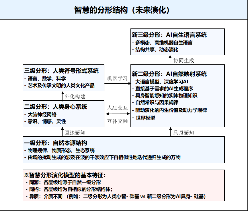 摘要:本文并不是一篇实证性的论文,而是针对人工智能的发展,在汇集了各跨学科最新研究成果之后,提出的一个基于分形理论的智慧演化模型。该模型认为:智能是系统获取智慧的能力,其核心是对自然复杂分形结构进行映射的效能;而智慧是由智能通过映射构建而成的高度结构化信息网络。自然世界的物质与规律构成一级分形结构(源分形),其终极本源是场的扰动(波)及能量耗散的协同作用;人类身心系统是通过进化形成的二级分形结构(自然的一级映射),是人类智能的具身载体;人类集体创造的形式符号系统是三级分形结构(心智的二级映射),是人类集体智慧的外化结晶;当前的人工智能则是四级分形结构(符号的三级映射),它仅具备强大的处理符号的能力,但尚未形成反映自然真实的智慧。本文系统论述了该模型的物理哲学基础、各级结构特征与转化机制,指出当前AI的核心局限在于其智能与自然本源及人类具身体验的双重隔绝,导致其无法构建具有“一手性”与具有内在意义的智慧。基于此,提出AI发展的根本路径在于实现从四级向二级分形的跨越——通过具身感知直接映射自然结构,使其智能构建直接根植于自然的智慧,并预言在此过程中将涌现出AI群体自组织的“新三级分形结构”,即一种多模态、高维的AI自生语言。最终,人类智慧与AI智慧将形成同源同构异质的多元分形智慧体系。