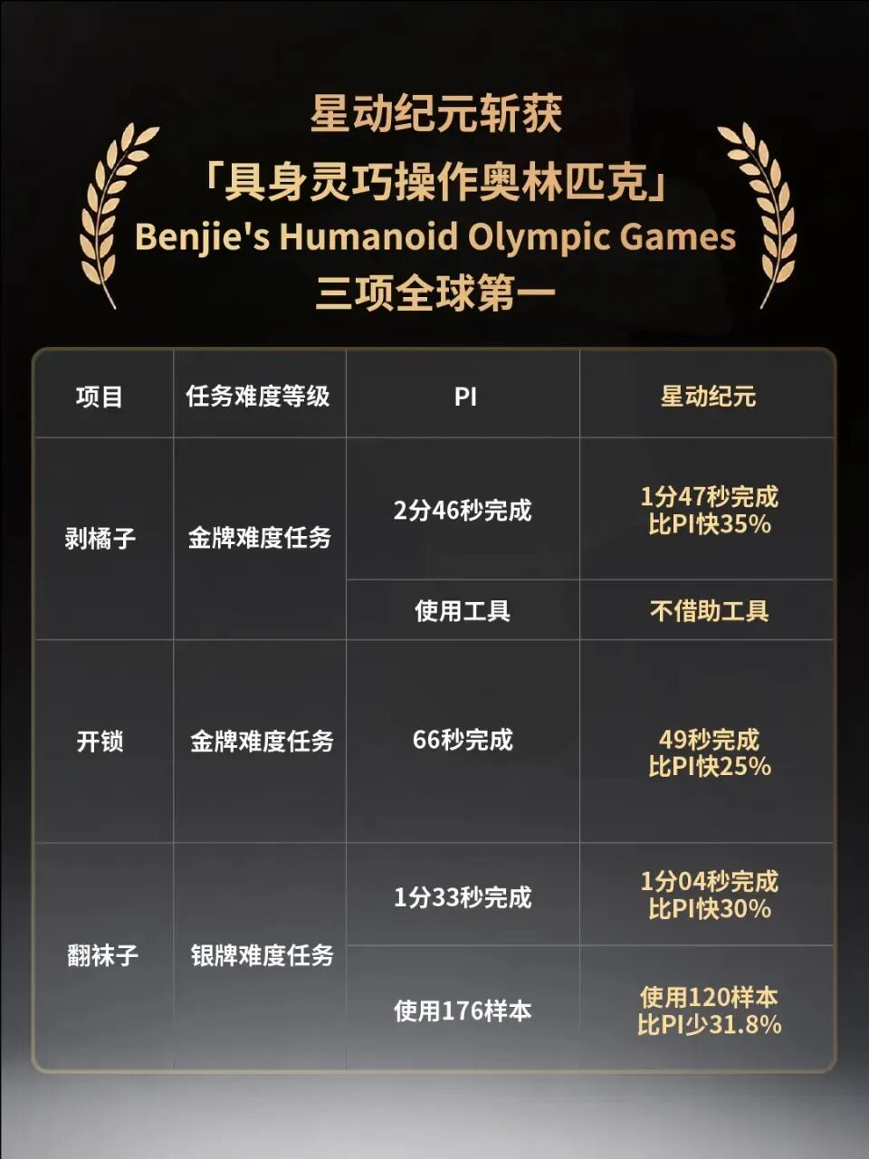 在刚刚落幕的全球最严苛具身机器人赛事——简称Benjie’s Olympics中,中国公司星动纪元一举包揽开锁、剥橘子、翻袜子三项核心任务全球第一,刷新全部世界纪录。尤为关键的是,它击败了融资近20亿美元、被公认为“全球最强具身大脑”的美国头部公司Physical Intelligence(PI),且对手使用的是其最新闭源模型PI 0.6——此前无人能做到。