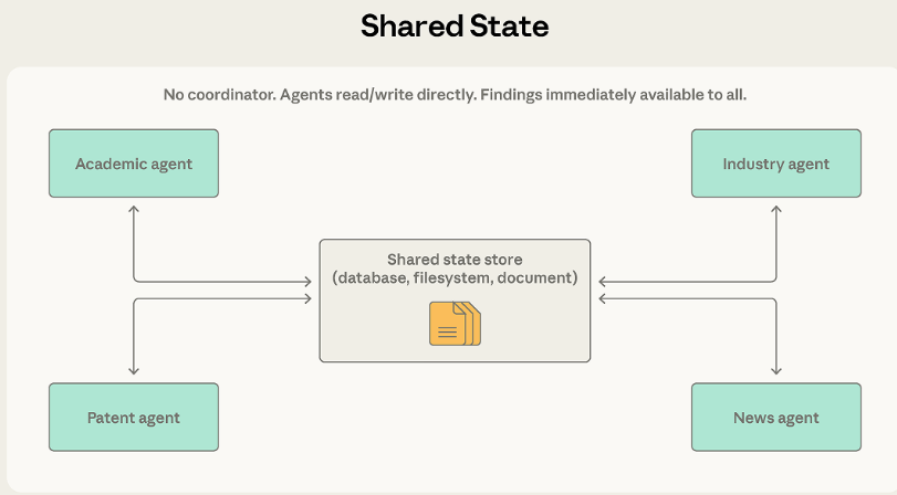 前述模式里,不管是协调者、团队主管还是消息路由器,都在中央牢牢把控信息的流向。共享状态模式踢开了所有中间商,智能体直接在一个大家都能读写的持久化存储空间里完成协作。