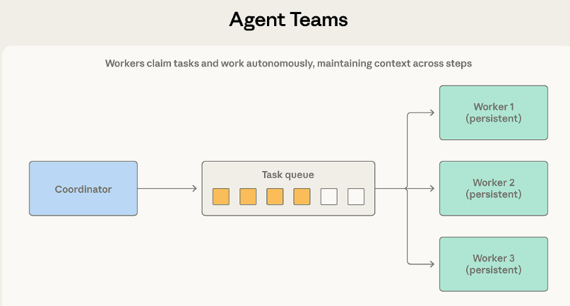协调员以独立进程的方式唤醒多个工作智能体。团队成员像流水线上的熟练工人,从共享的待办队列中主动领走任务,在多个连续的操作步骤中自主推进进度,搞定全部流程后向协调员发送完工信号。