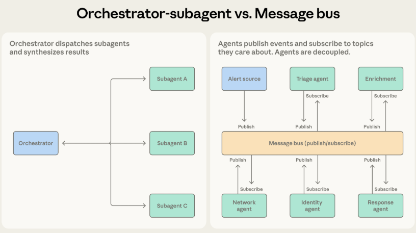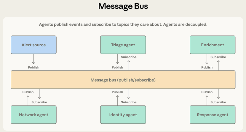 流水线式的处理机制与消息总线堪称天作之合。事件从上游一路向下游流转,开发团队完全可以根据新出现的威胁类型,随时往系统里塞入新型智能体,彼此开发、部署互不干扰。工作流由动态事件催生出来,且系统内的智能体生态大概率会持续膨胀时,选择该架构准没错。