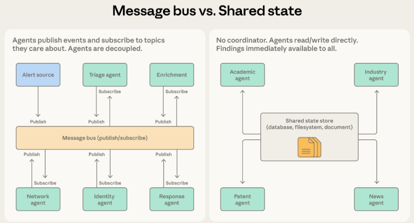 智能体接力处理流水线上的独立事件时,选消息总线。安全警报一关过完平滑送往下一关,分发效率奇高。智能体需要随时间推移不断累积调查成果时,选共享状态。研究系统需要持续搜集知识,智能体反复去仓库里淘金,根据别人发现调整调查方向。消息总线毕竟有个中心化的路由器在指挥交通,共享状态则是真正的去中心化,消除单点故障最彻底。大家在消息总线里发消息若只为共享情报而非触发动作,请尽早换成共享状态模式。