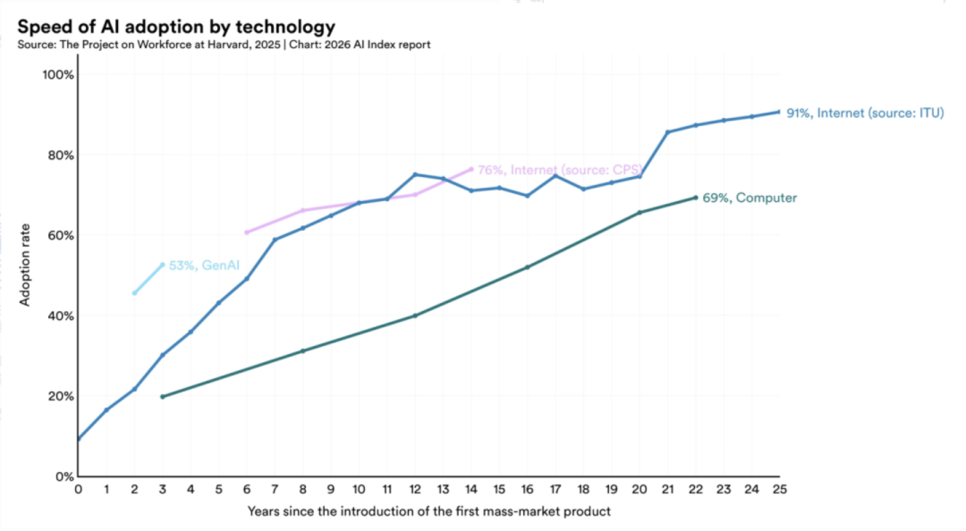 报告指出,AI 技术的普及速度空前。过去三年,生成式 AI 渗透率已经达 53%,快于个人电脑与互联网;企业采用率 88%,超 80% 大学生使用生成式 AI。